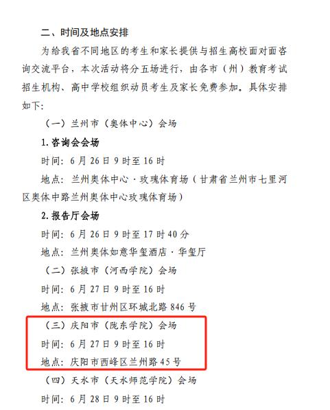 慶陽網訊(慶陽融媒記者 劉英娟)為深入貫徹落實教育部“高考護航行動”要求,服務甘肅省高考考生及家長,6月27日9時至16時,2025年甘肅省普通高校招生咨詢會將在隴東學院舉辦。