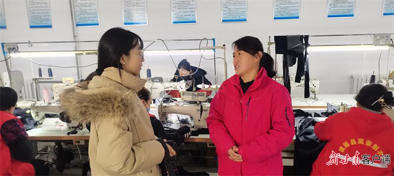 馬銀萍(右二)調(diào)研村里服裝加工廠經(jīng)營(yíng)情況。