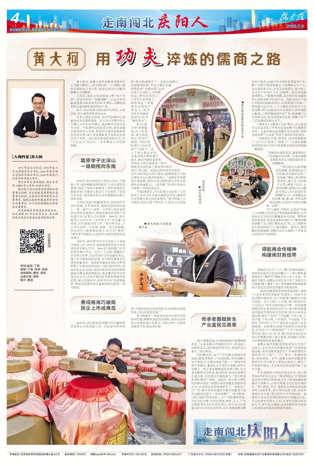 一邊執(zhí)掌融資租賃集團登陸港股,破除“小企業(yè)難登資本殿堂”的成見;一邊復(fù)興永春老醋非遺技藝,在千年酸香中醞釀鄉(xiāng)村振興新篇。由甘入閩二十余載,黃大柯始終以“立己達人”的行為準(zhǔn)則做人行事。擔(dān)任福建省泉州市永春縣政協(xié)委員后,黃大柯的提案始終緊扣當(dāng)?shù)亟?jīng)濟社會發(fā)展,結(jié)合永春縣縣情民情,他寫下包含“千年老醋、千年古剎、千年古榕、千年古渡、千畝蔗園、千畝濕地、千畝稻田”在內(nèi)的“七個千”城市農(nóng)文旅及產(chǎn)業(yè)發(fā)展提案。此提案后來被當(dāng)?shù)卣杉{并修改,擴充加入“千棵荔枝樹”“千萬個負(fù)離子”等內(nèi)容,將山、水、田、林、路、村的全域生態(tài)化綜合治理理念植入地方發(fā)展,形成振興縣域、鄉(xiāng)村多領(lǐng)域的發(fā)展新理念。