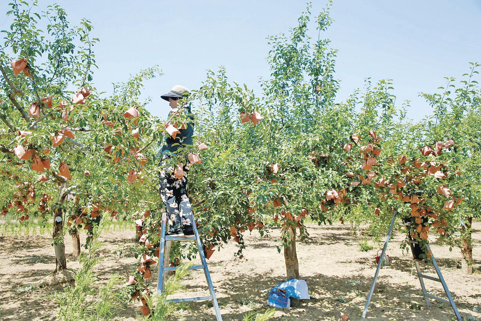 北倉村村民為蘋果套袋。 慶陽融媒記者 劉易萌 攝
