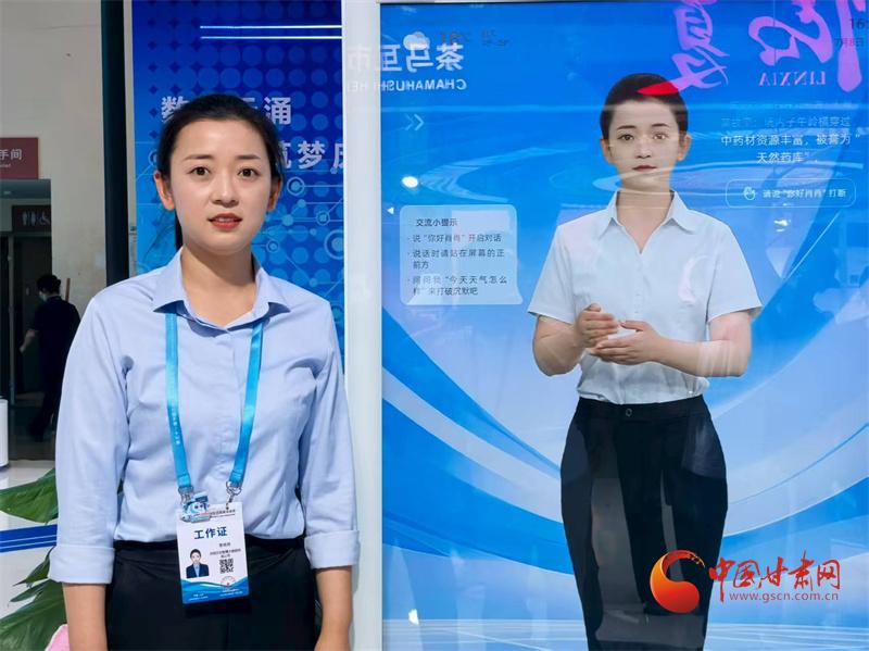 第三十一屆蘭洽會慶陽館,講解員李肖肖和自己的數(shù)智人“肖肖”合了個影,兩“人”看上去很像,而且神似。