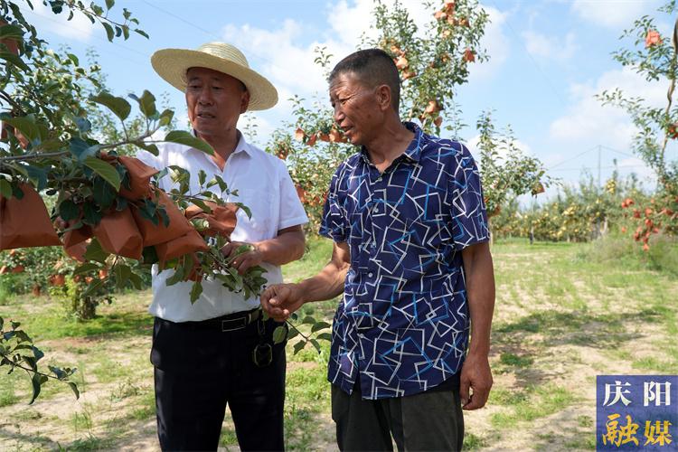 ▲張文輝(左一)與果農(nóng)查看蘋(píng)果長(zhǎng)勢(shì)。