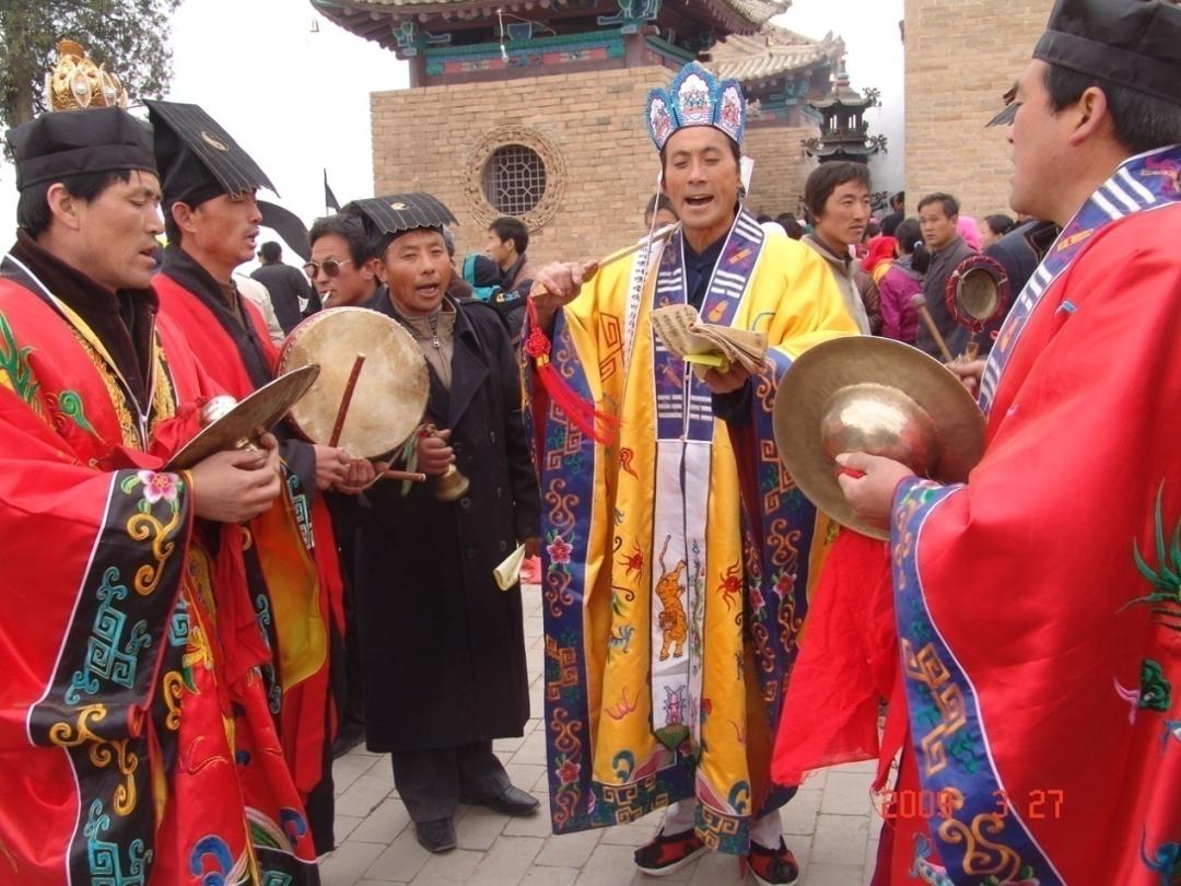 道教創(chuàng)立于東漢時期,并有了自己的廟宇(宮、觀、洞、院),也有了專業(yè)從教人員和祭祀活動。這種專在廟宇進(jìn)行的齋醮儀式活動(法事)則須有各種樂器和樂曲為它服務(wù),即今之道教音樂。環(huán)縣各鄉(xiāng)鎮(zhèn)差不多都有民間道人(陰陽)做各種齋醮儀式、祭祀鬼神、祈禳禁咒活動,這些民間道人也成為道教音樂的傳承者。環(huán)縣四合塬東老爺山是元朝時修建的道觀,道教活動十分興盛,并向四周進(jìn)行傳播。按流派分為中宮、東宮、南宮、西宮和北宮等五宮,至今仍有中宮和南宮活動。每年農(nóng)歷三月初三,是東老爺山無量祖師的圣誕,都會舉行盛大的酬神祝歲搭醮等各種儀式,而這種儀式在縣內(nèi)的其他廟宇內(nèi)也十分普遍。