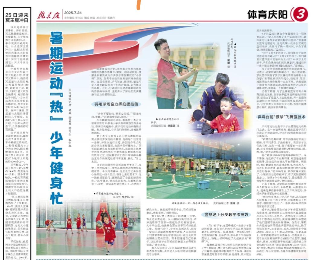 慶陽網(wǎng)訊(慶陽融媒記者 梁媛 徐嘉英 實習生 張宇航)隨著暑假的開啟,我市青少年參與體育鍛煉的熱情不斷攀升,掌握一項運動技能、增強身體素質(zhì)成為許多孩子暑假期間的“必修課”,因此,各類專業(yè)性的體育培訓班備受青睞。在羽毛球場、乒乓球館、籃球場,隨處可見不同年齡段的孩子們揮汗如雨,奮力練習的場景。近日,記者將目光對準體育培訓機構(gòu)的教練與學員,讓更多人了解他們充滿健康與活力的暑期生活。