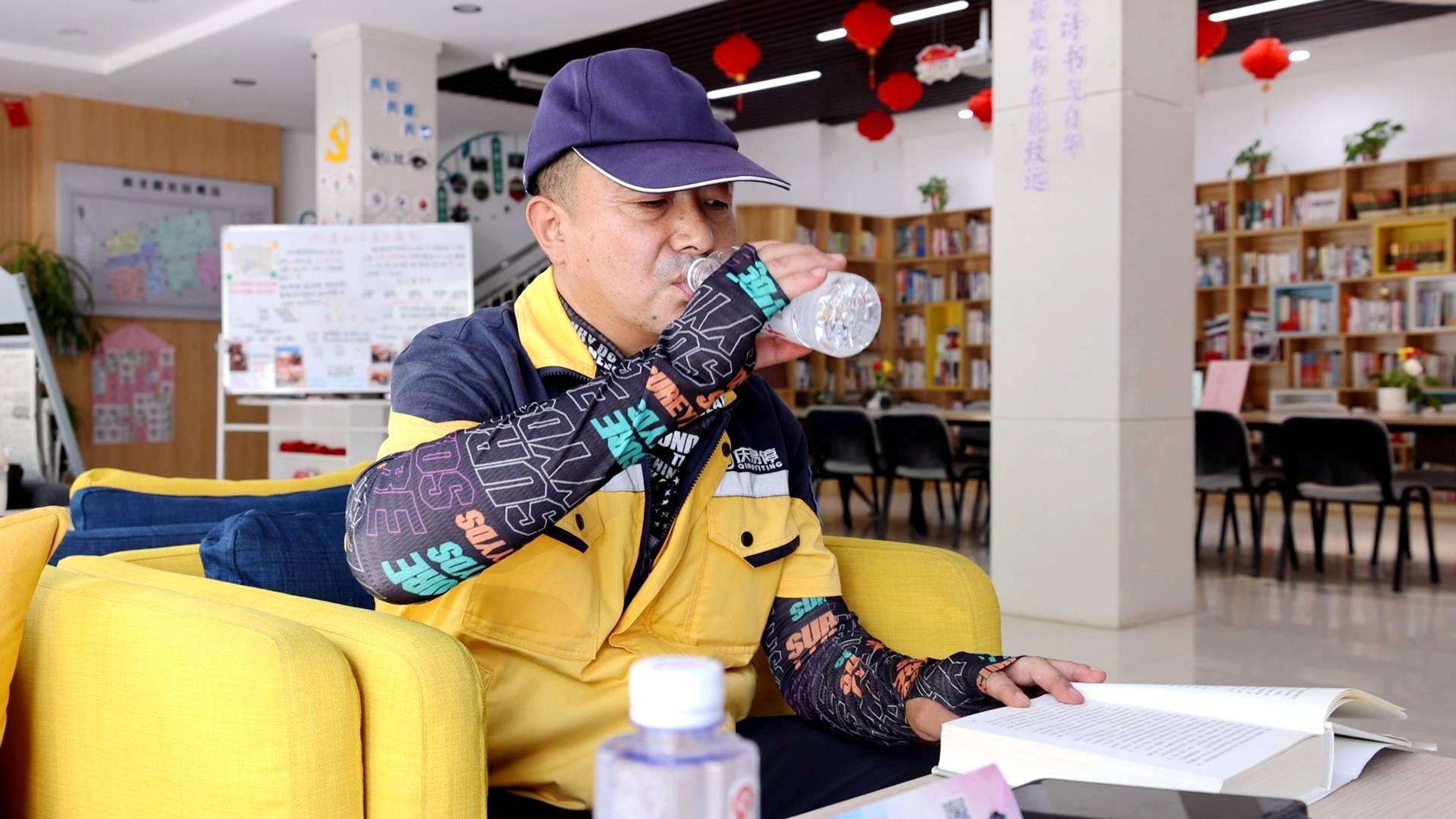 戶外勞動者在育才路社區(qū)工會驛站納涼閱讀(西峰區(qū)融媒體中心供圖)