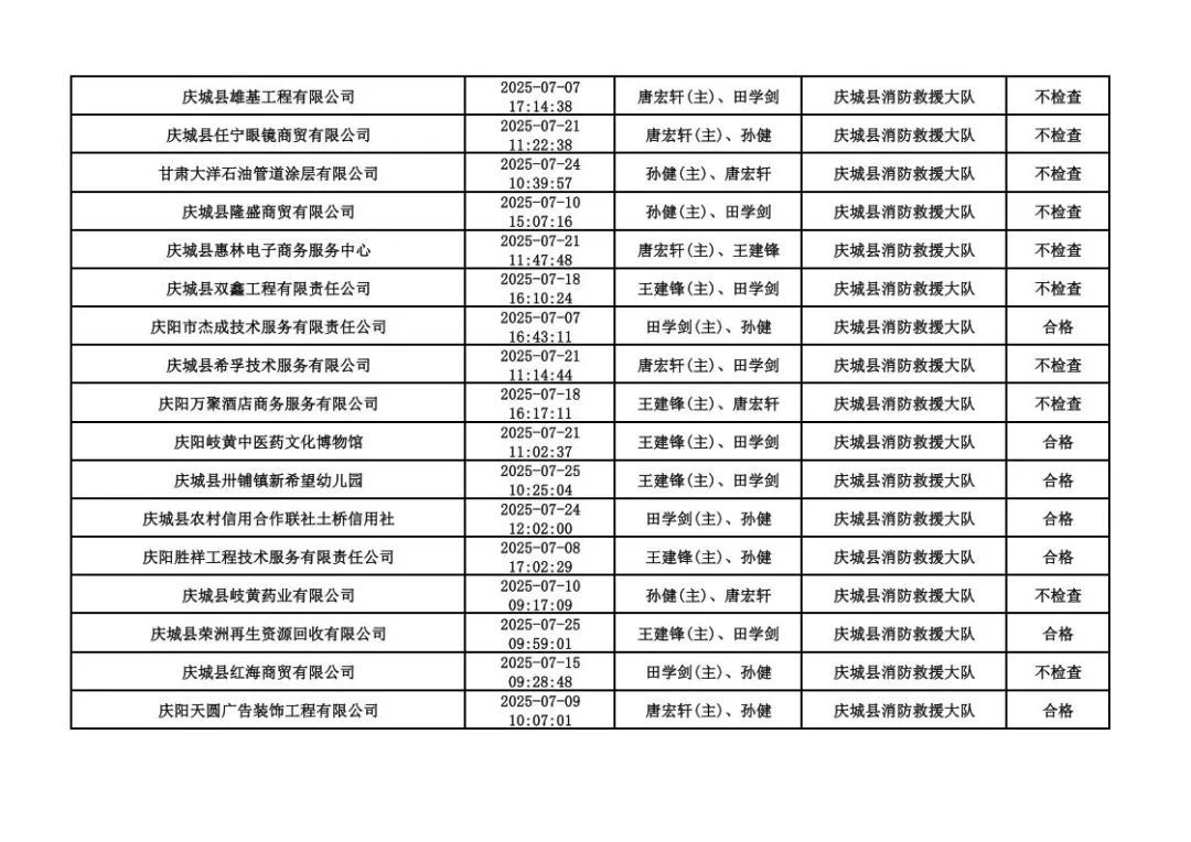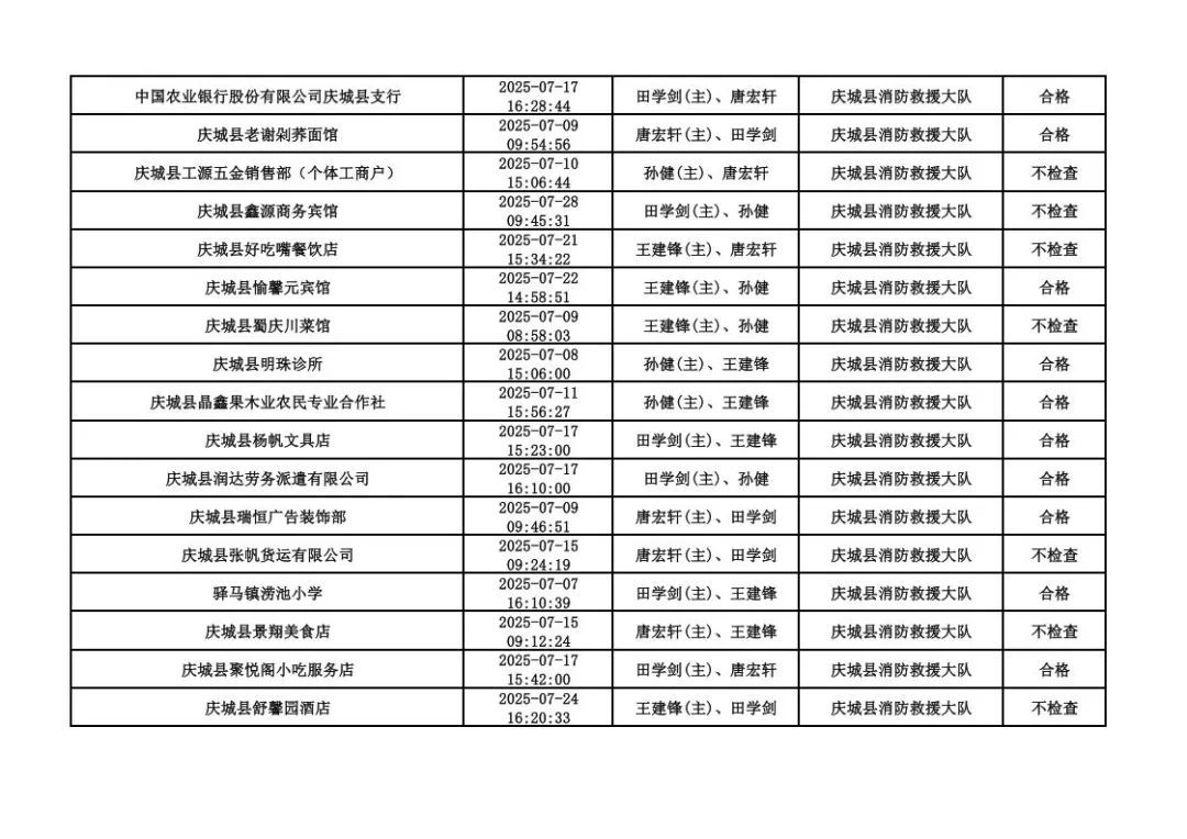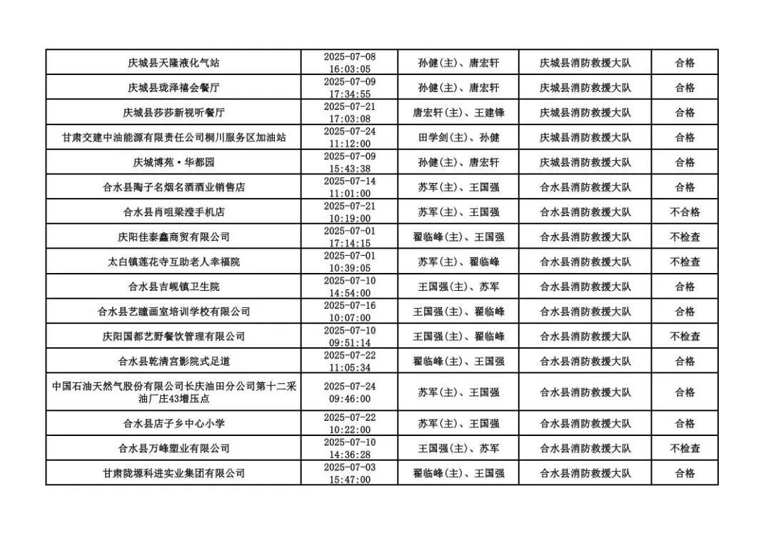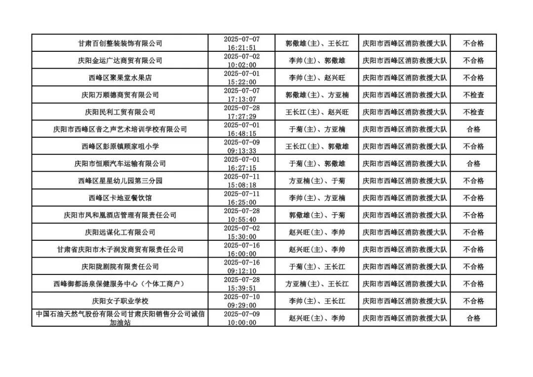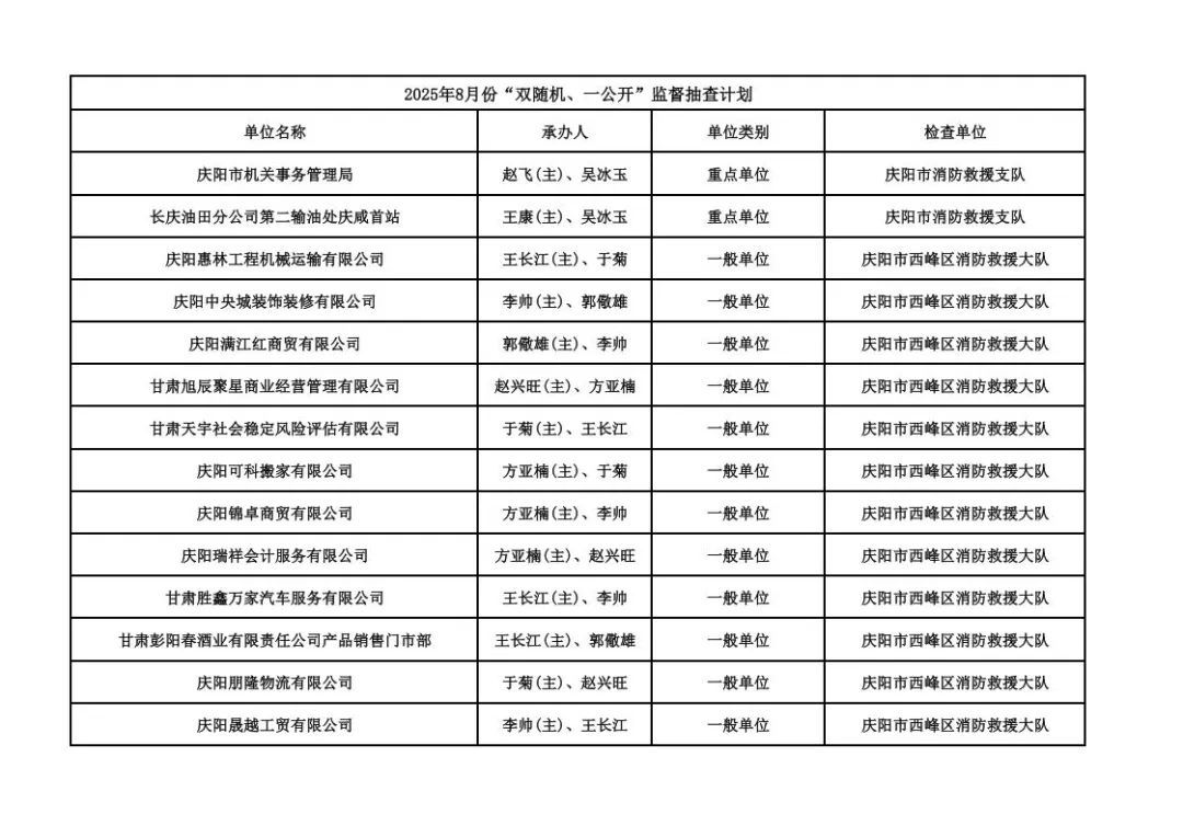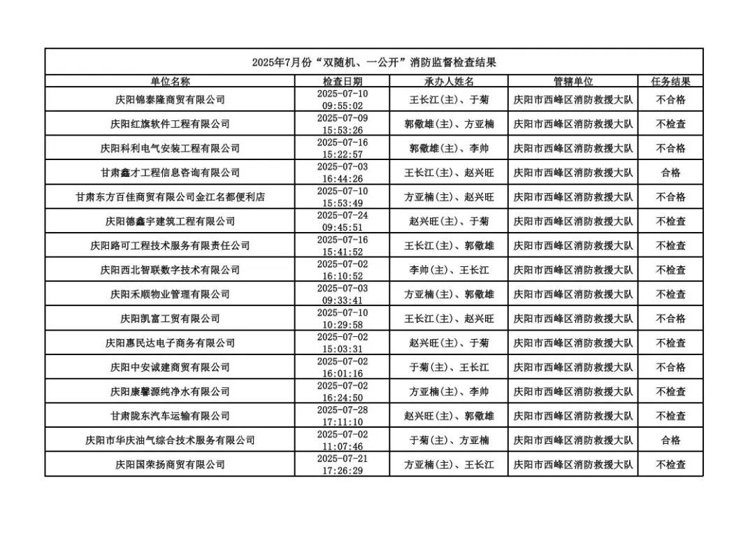 為貫徹落實《消防救援局關于全面推行“雙隨機、一公開”消防監(jiān)管工作的通知》(應急消〔2019〕241號),認真組織實施“雙隨機、一公開”消防監(jiān)管工作,現將2025年7月份“雙隨機、一公開”消防監(jiān)督檢查結果及2025年8月份監(jiān)督抽查計劃公示如下: