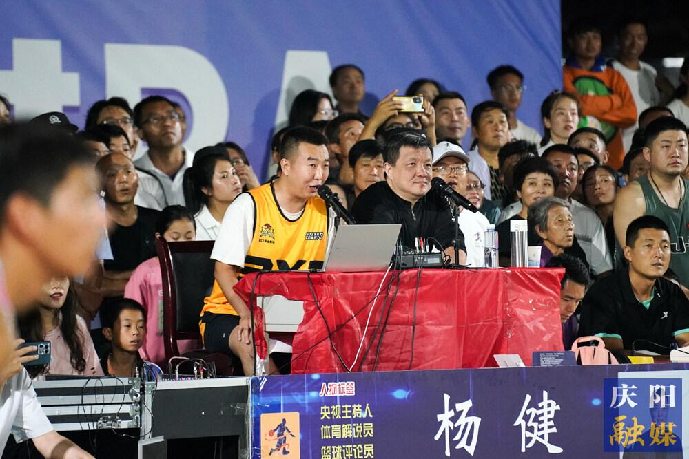 央視主持人、體育解說(shuō)員楊?。ㄓ遥┖透拭C本土籃球解說(shuō)員胡京繁(左)共同為球迷現(xiàn)場(chǎng)解說(shuō)。