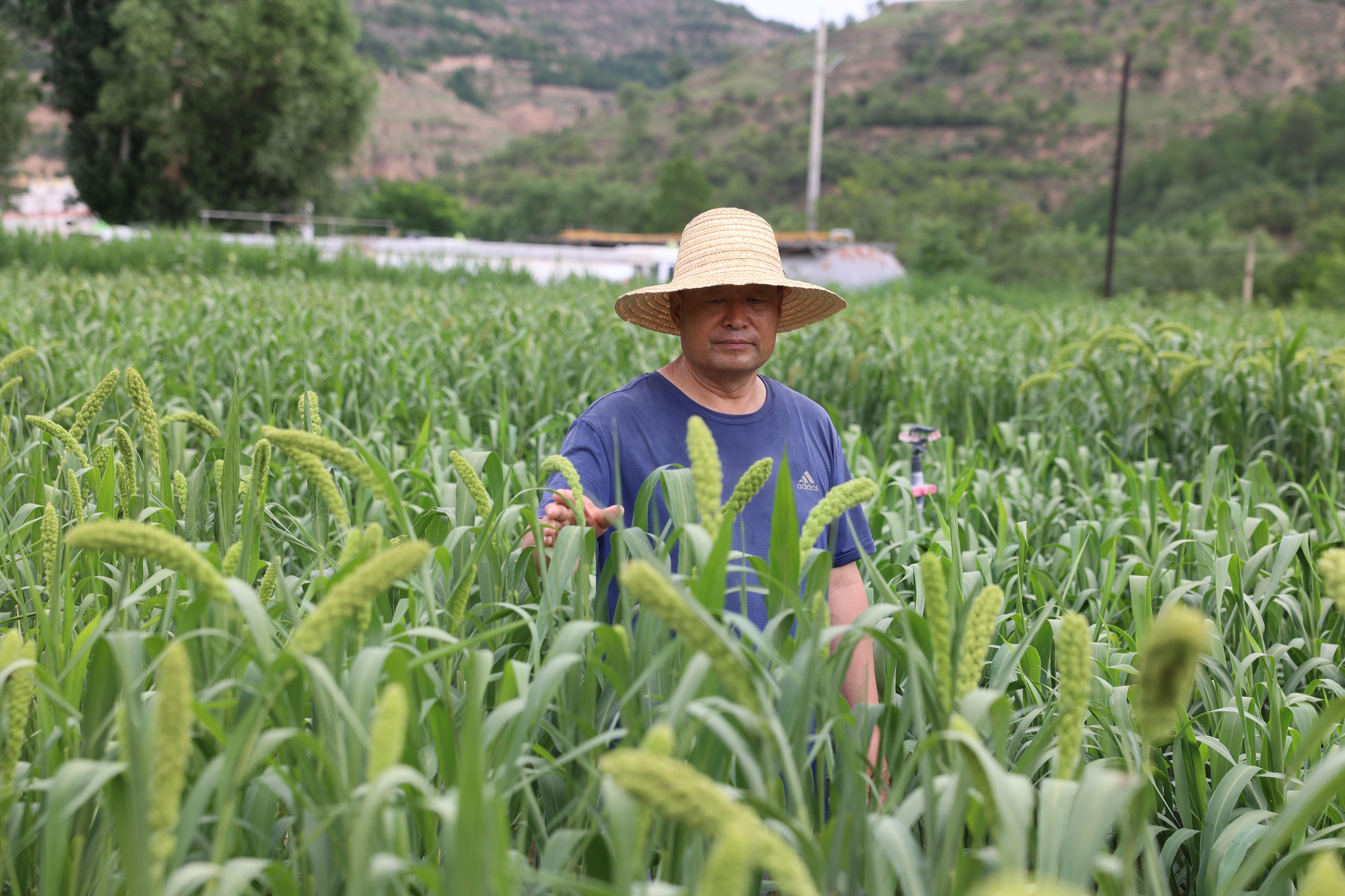 譙顯明查看谷子長(zhǎng)勢(shì)。