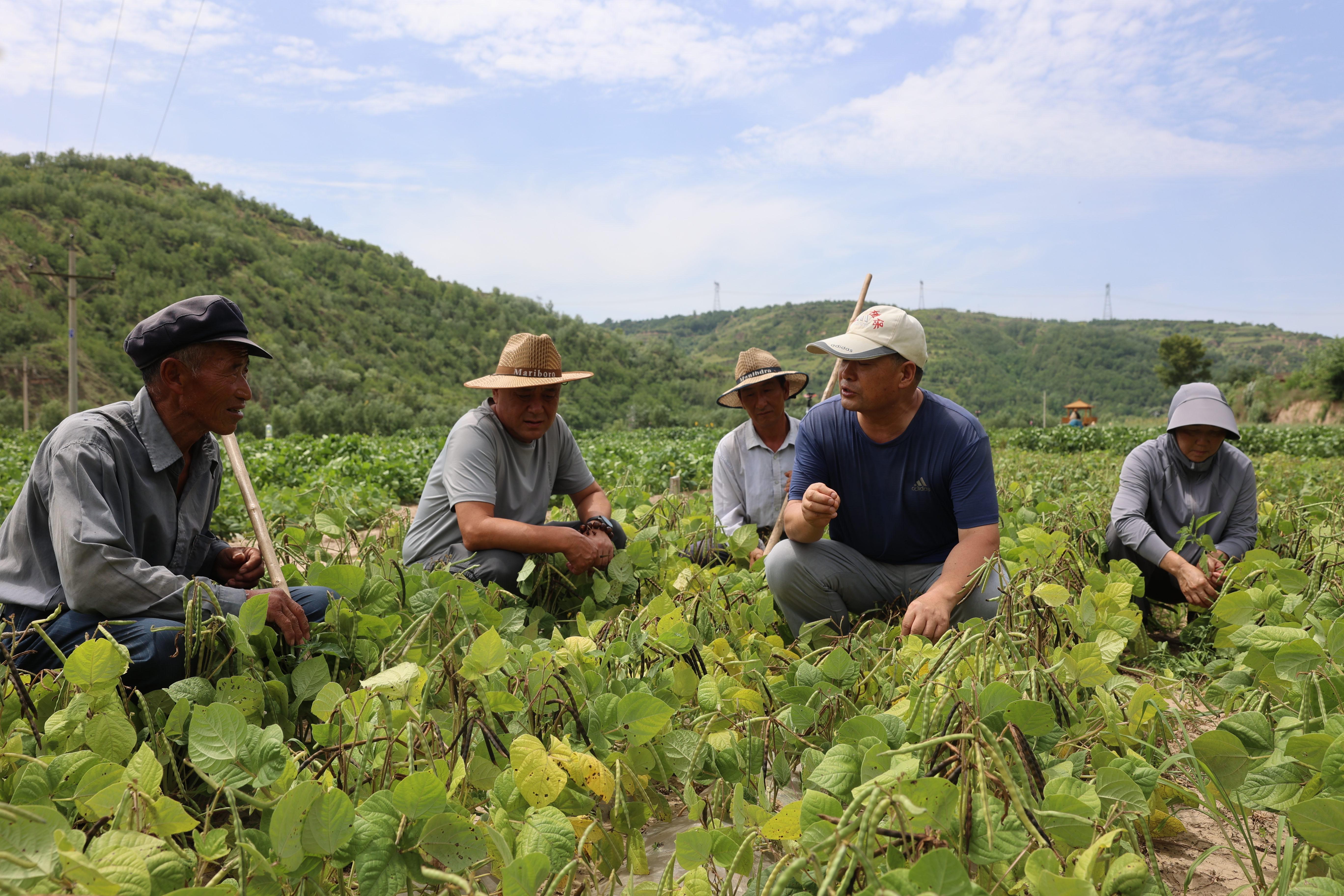 譙顯明(右二)與農(nóng)民探討紅小豆后期管理問(wèn)題。