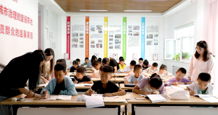 在環(huán)城鎮(zhèn)光明路社區(qū),這已是第四年舉辦愛心托管班。今年,37名不同年齡段的孩子匯聚于此。明亮的教室里,孩子們或?qū)W鴮懯罴僮鳂I(yè),或沉浸在課外書籍的海洋。4名大學(xué)生志愿者精心安排課程與活動,確保托管不僅僅是“看住孩子”,更注重“托”出質(zhì)量、“管”出成長。