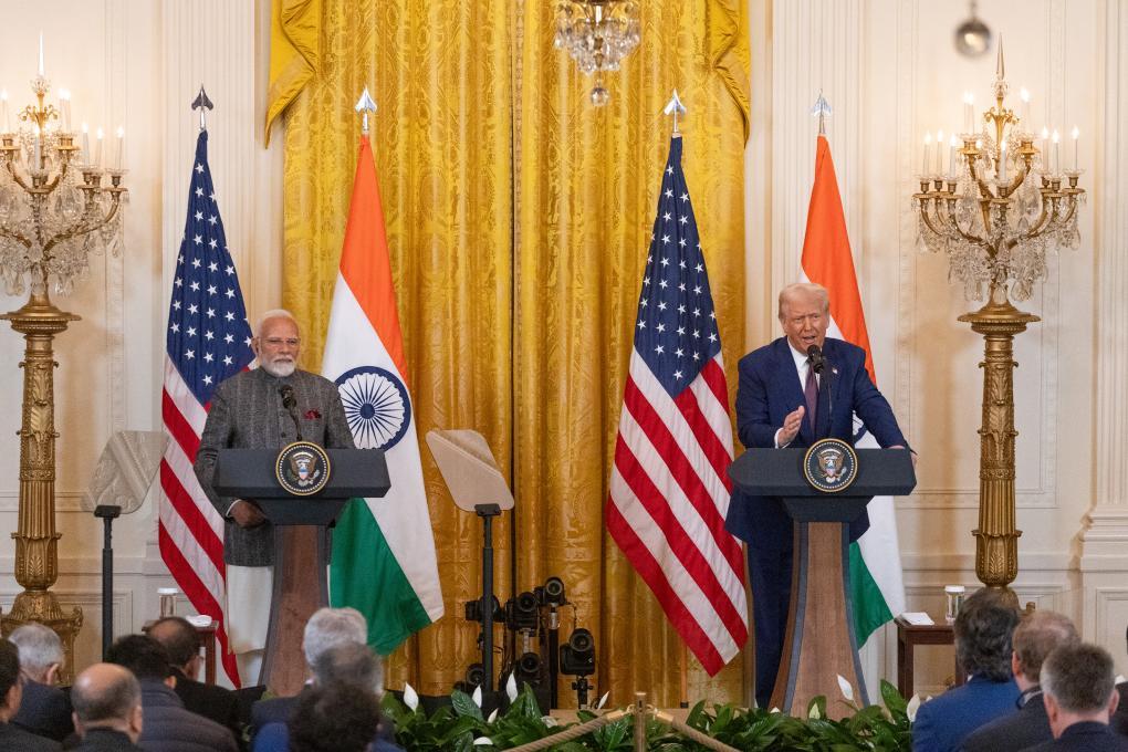 2月13日,美國(guó)總統(tǒng)特朗普(右)與到訪(fǎng)的印度總理莫迪在華盛頓白宮出席聯(lián)合記者會(huì)。新華社記者胡友松攝