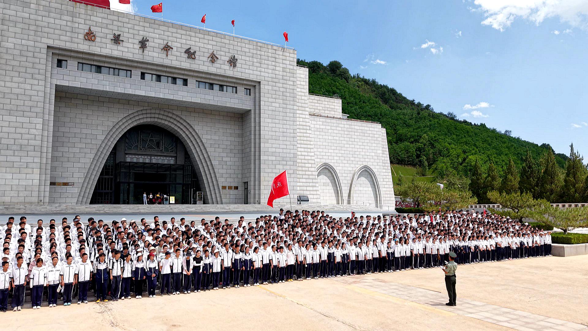 研學(xué)學(xué)員在南梁革命紀(jì)念館前合唱革命歌曲。