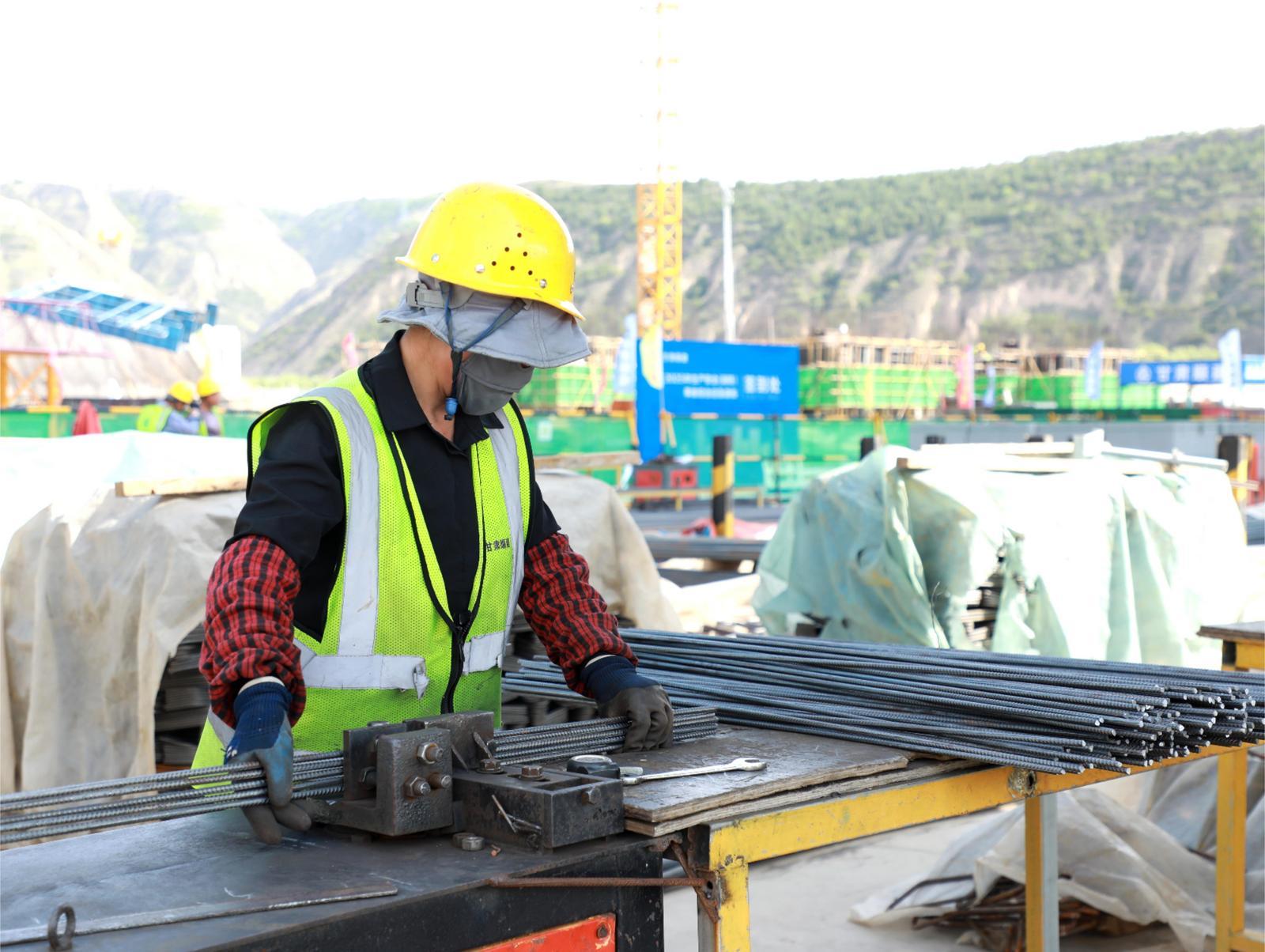 南區(qū)保障性住房項(xiàng)目現(xiàn)場(chǎng)鋼筋加工區(qū),工人在制作箍筋。