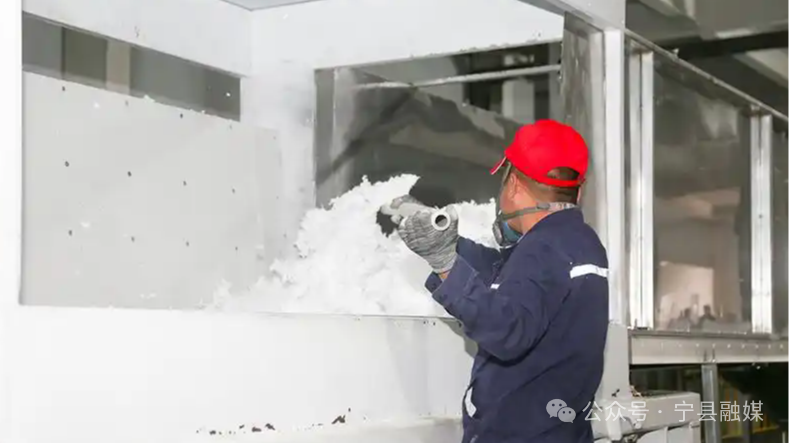 “世寧新材年產(chǎn)1.25萬噸微纖維玻璃棉生產(chǎn)線是全國唯一實現(xiàn)離心法生產(chǎn)29度和34度微纖維玻璃棉的生產(chǎn)線,對于生產(chǎn)技術(shù)來說,它實現(xiàn)了節(jié)能減排,碳中和的重要任務(wù)指標,它生產(chǎn)的微纖維玻璃棉只有頭發(fā)絲的一百五十分之一,主要應(yīng)用于儲能電池,高效節(jié)能,空氣環(huán)保過濾三大領(lǐng)域?!备拭C世寧新型材料有限公司工程師劉琛介紹說。