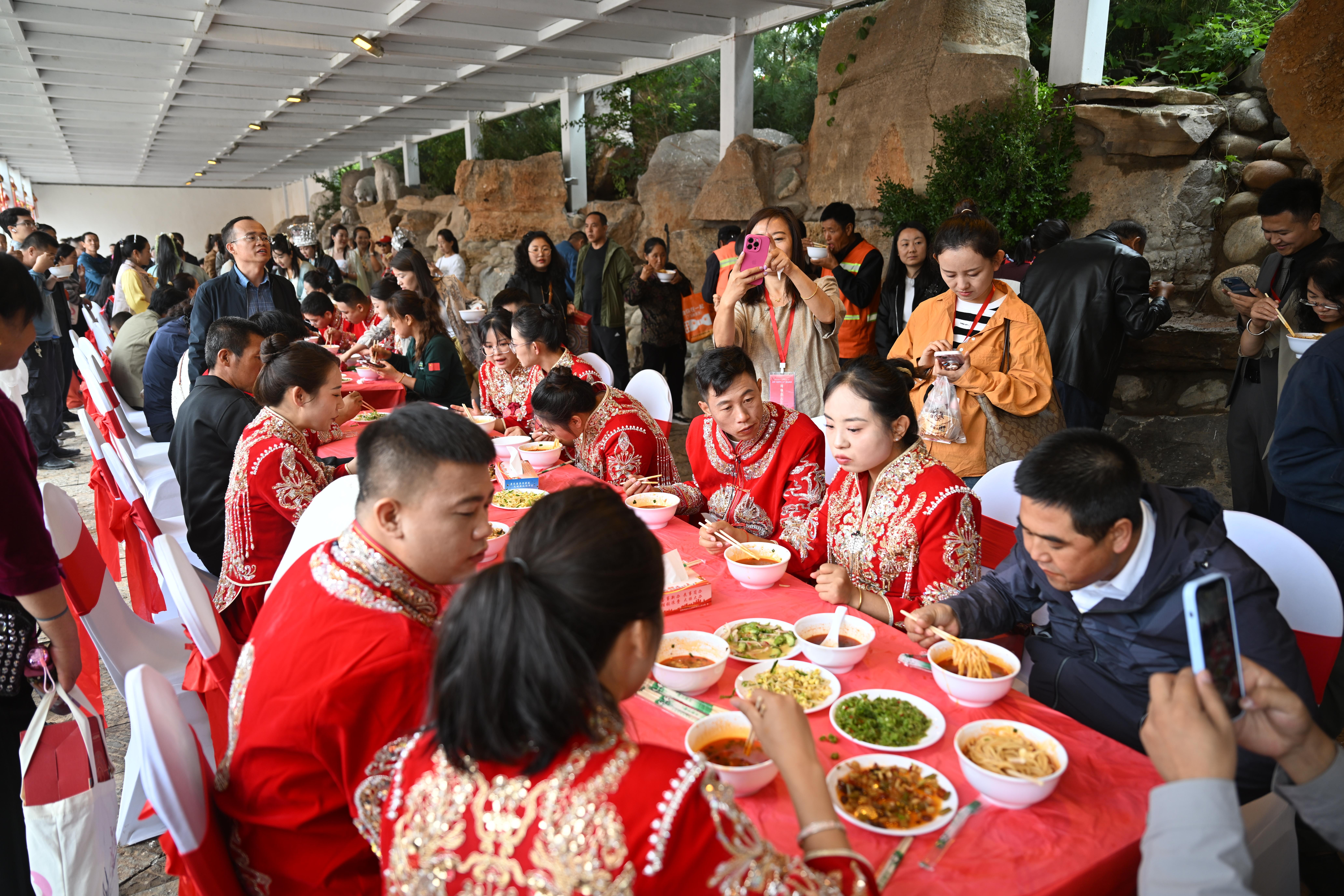 10時(shí)45分,新人“掛同心鎖”“認(rèn)領(lǐng)幸福樹”、花車古城巡游依次展開,沿途群眾駐足祝福;繡樓廣場北側(cè),“一面之約”簡餐溫情開席,在這美好時(shí)刻,新人及親友共享幸福滋味。