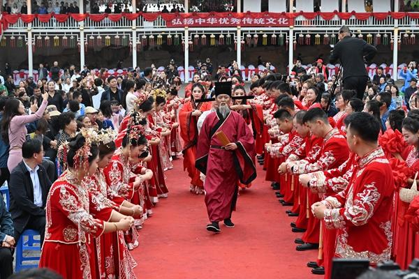 儀式上,新人代表宣讀《抵制高額彩禮 倡樹婚戀新風(fēng)》倡議書,倡導(dǎo)健康、節(jié)儉、文明的婚嫁之風(fēng),拒絕鋪張浪費(fèi),讓彩禮回歸“禮”的本質(zhì)。隨后進(jìn)行的隴東文明婚俗展示暨文藝演出中,主婚人帶領(lǐng)15對新人行“三拜禮”、飲合巹酒、宣讀文明誓言。甘肅省民政廳負(fù)責(zé)同志現(xiàn)場為新人們頒發(fā)結(jié)婚證,與會嘉賓向新人送上"新風(fēng)禮包"祝福。