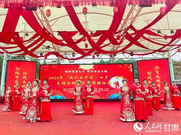 8月29日,農(nóng)歷七月初七,甘肅慶城縣藥王洞養(yǎng)生小鎮(zhèn)迎來了一場別開生面的七夕盛會。2025年甘肅省“我們的節(jié)日·七夕”省級主場活動在這里浪漫啟幕,15對新人以一碗慶陽饸饹面為約,許下相伴一生的承諾。
