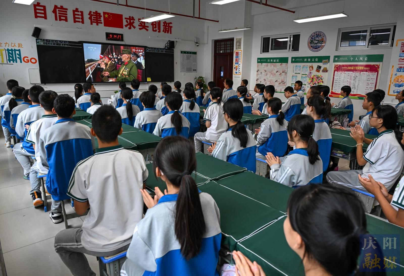西峰區(qū)黃官寨實(shí)驗(yàn)學(xué)校師生收看九三閱兵直播。通訊員 何宜蓉 攝