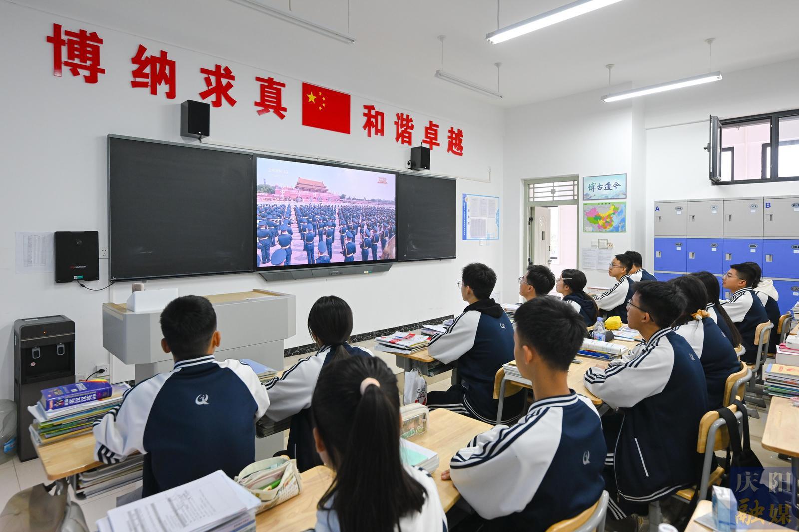 西峰區(qū)顯勝實(shí)驗(yàn)學(xué)校師生收看九三閱兵直播。通訊員 毛娜娜 攝