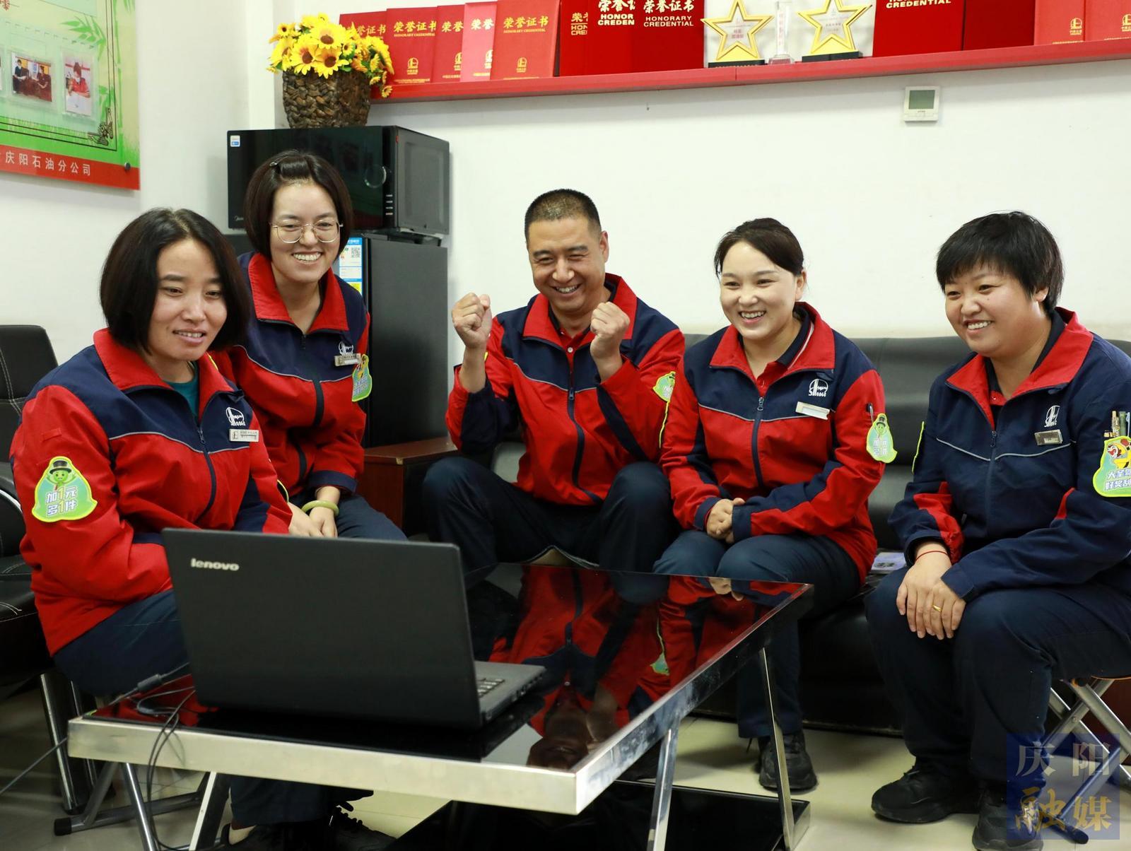 中國石化環(huán)縣南街加油站工作人員收看九三閱兵直播。通訊員 史珊 攝