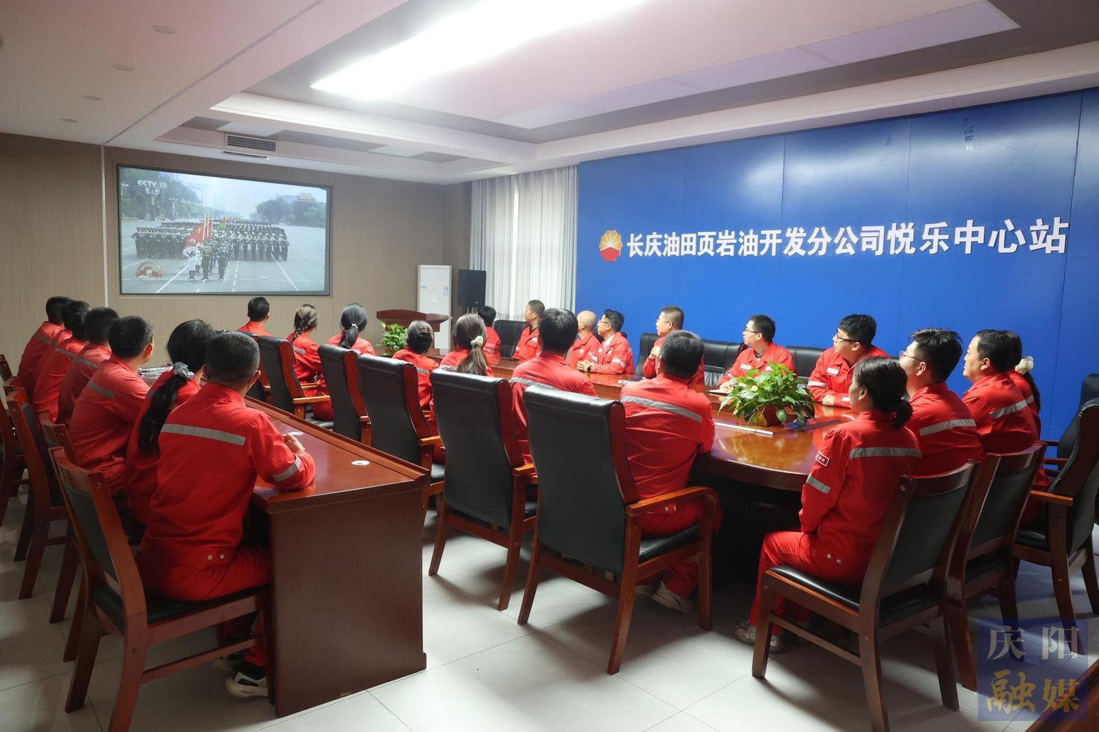 長慶油田頁巖油開發(fā)分公司悅樂中心站全體職工收看九三閱兵直播。通訊員 田偉 攝