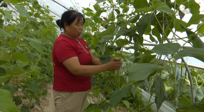 “我家的四個大棚,開始種的是甜瓜,甜瓜下市后種的蔬菜,有豆角、辣椒、黃瓜,菜成熟后客商上門收購,價格合理我們也省事?!焙渭遗湘?zhèn)趙樓子村村民嚴小琴說。