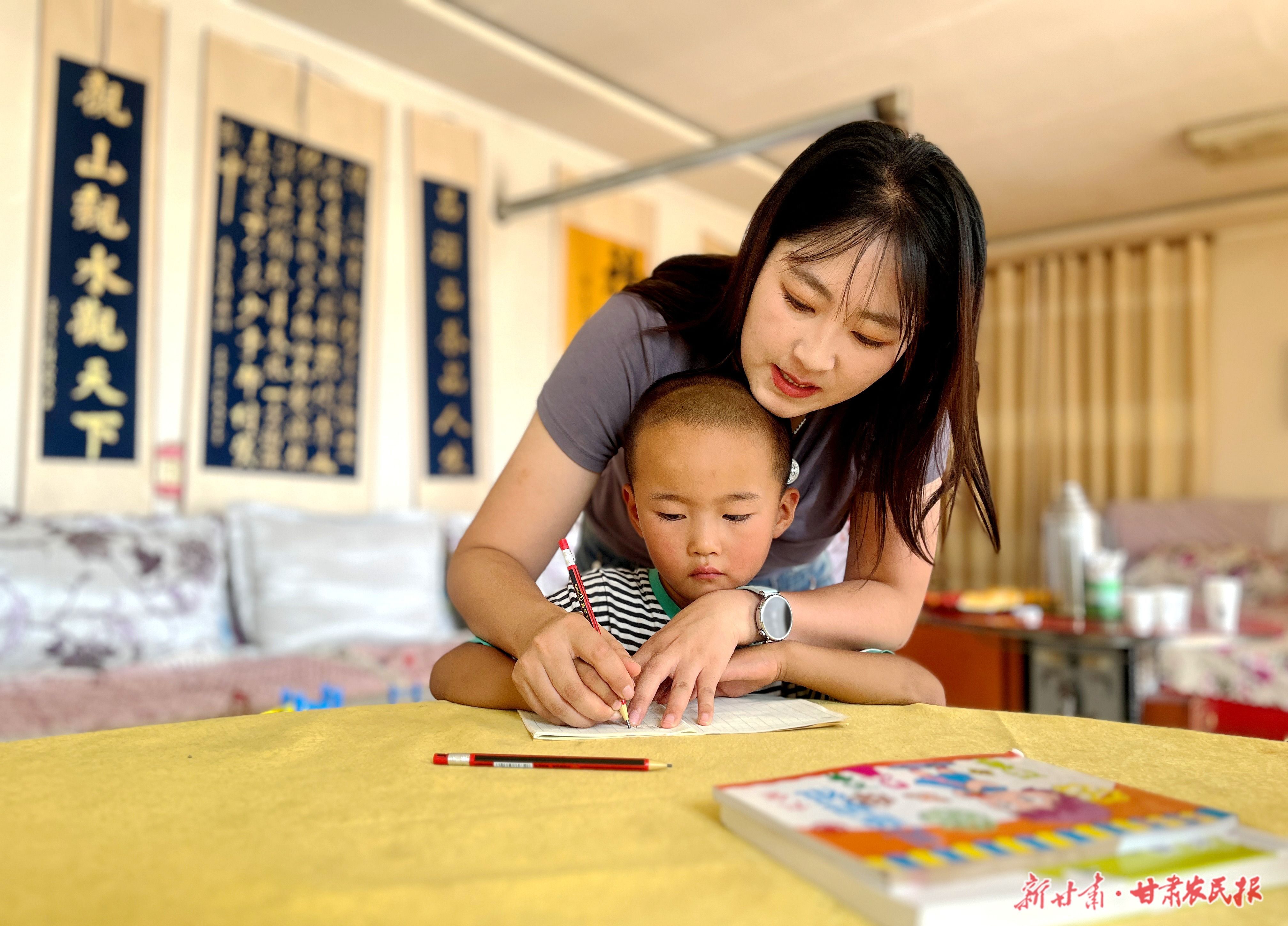 “今天你想學(xué)什么字,何媽媽教你?!薄拔蚁雽懽约旱拿?。”在西峰區(qū)彭原鎮(zhèn)鄢旗坳村,“愛心媽媽”何娜娜正握著5歲結(jié)對兒童孫維希的手,一筆一畫教他寫下自己的名字。
