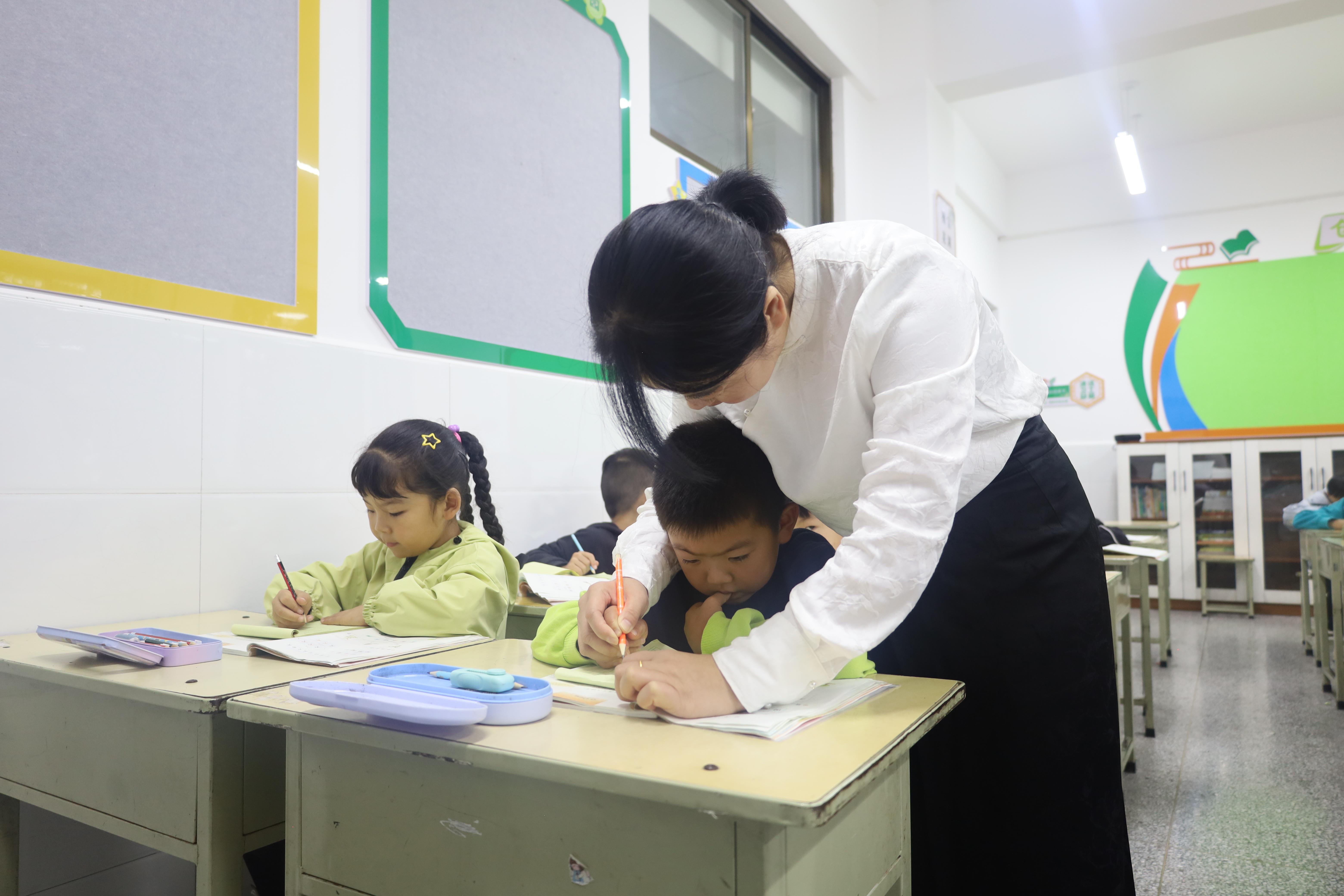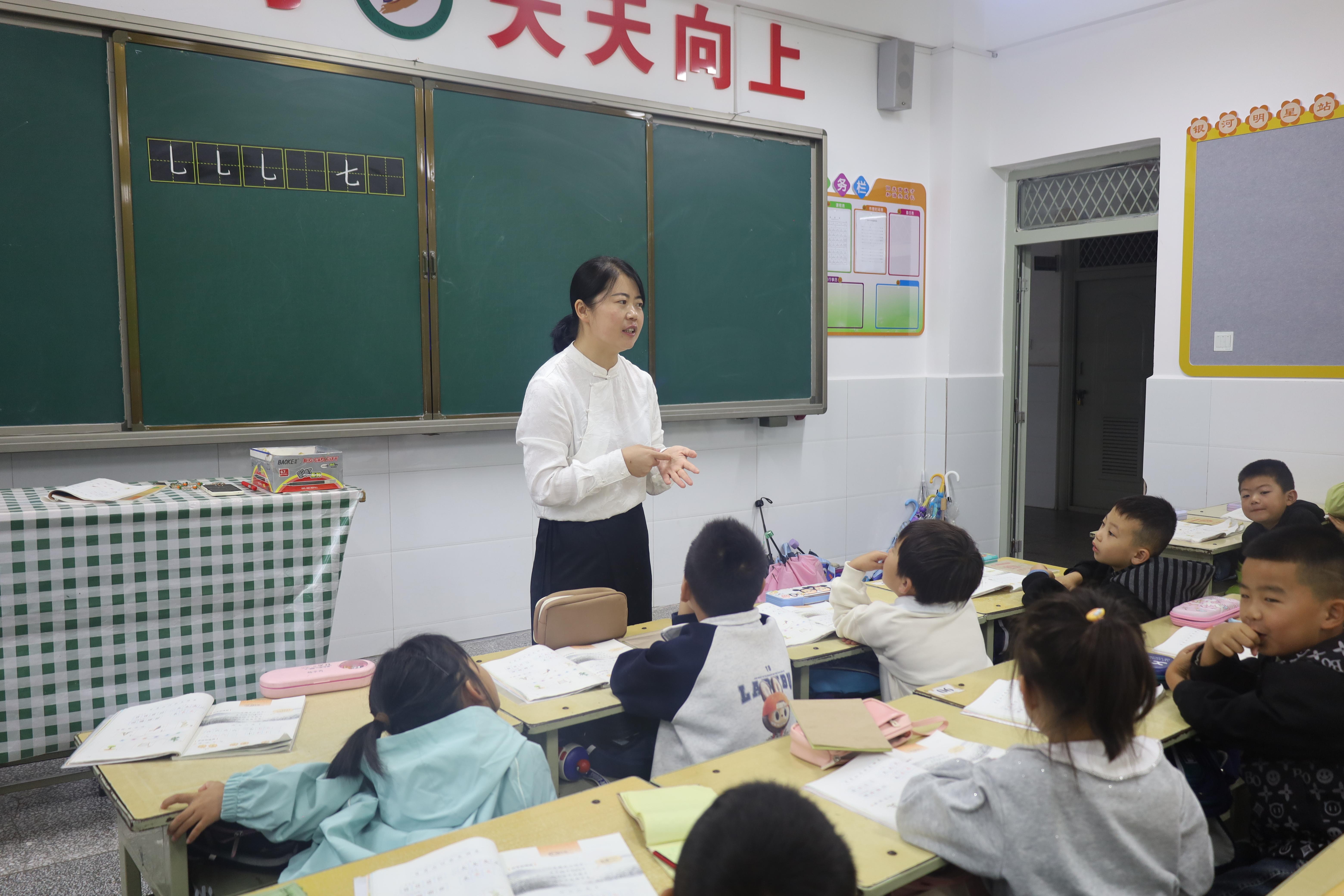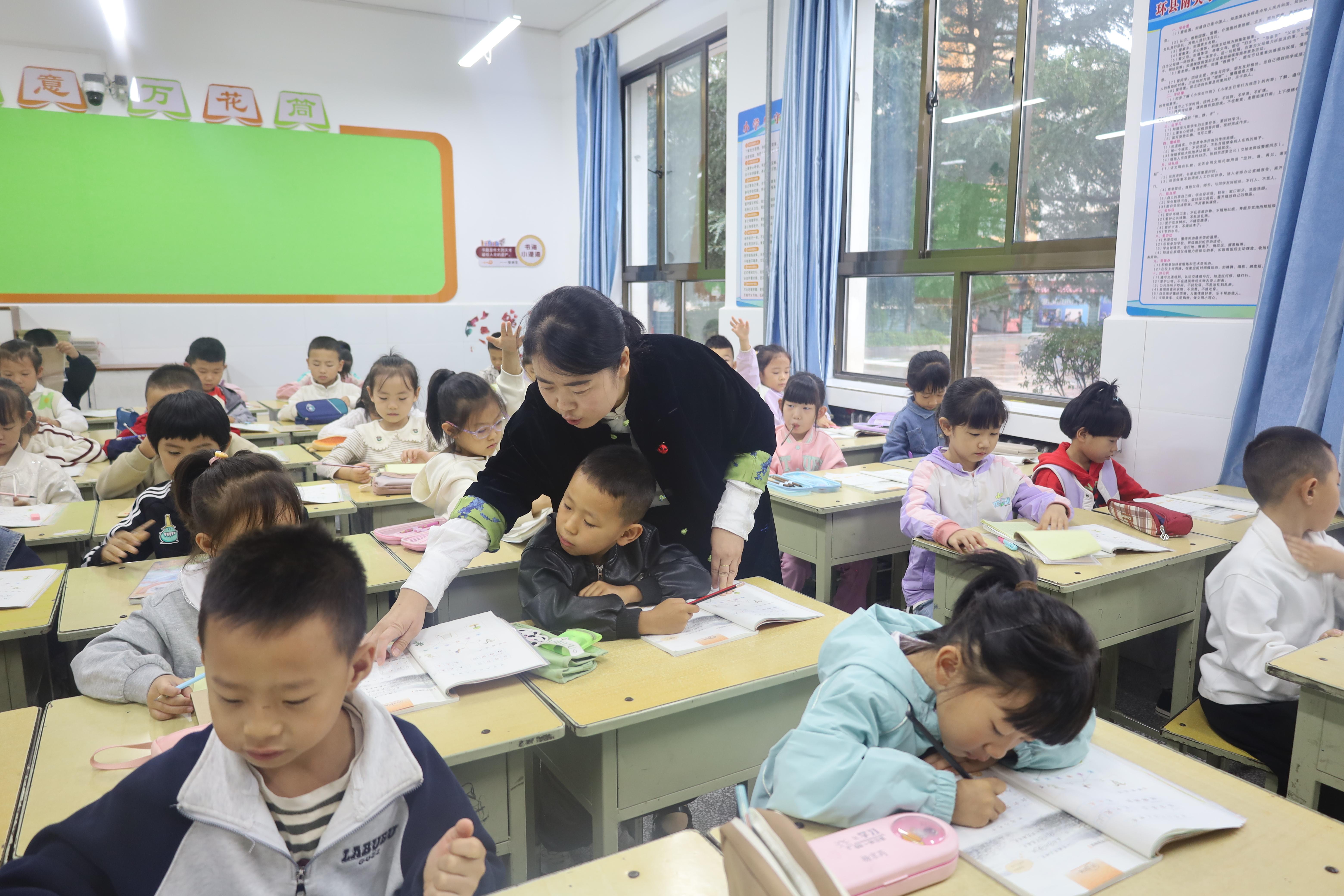 清晨,在環(huán)縣南關(guān)小學(xué)一年級(jí)(10)班的教室,龔金鳳站在田字格黑板前一筆一劃地給孩子們講解生字部首的概念,講臺(tái)下的孩子們聽(tīng)得聚精會(huì)神?!拔易钕矚g我們班的龔老師了,有時(shí)候我們表現(xiàn)的好,她會(huì)給我們發(fā)小獎(jiǎng)品,她是最溫柔的老師?!蹦详P(guān)小學(xué)學(xué)生張悅開(kāi)心地說(shuō)。