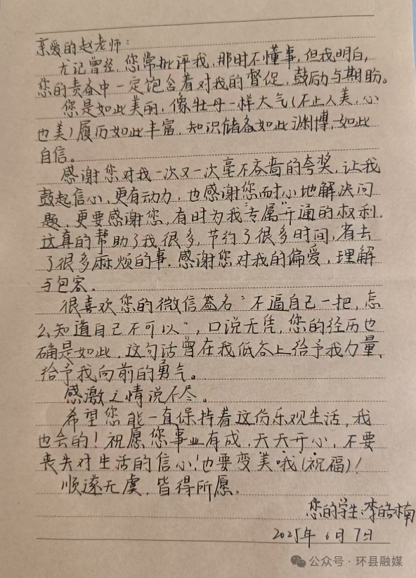 畢業(yè)后,李皓楠寫了一份感謝信,信中提到:“趙老師,您既是我的良師,在我迷茫時(shí)為我指引前行的方向;又是我的益友,在我失落時(shí)給予我溫暖的陪伴,我會(huì)永遠(yuǎn)銘記您的恩情。”字里行間,滿是對(duì)趙老師的感激與敬愛。