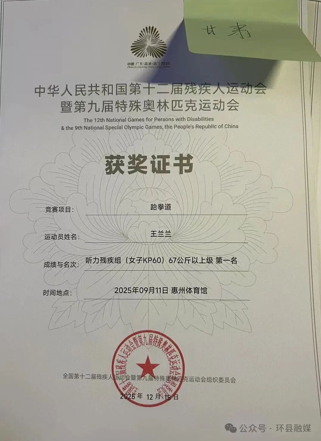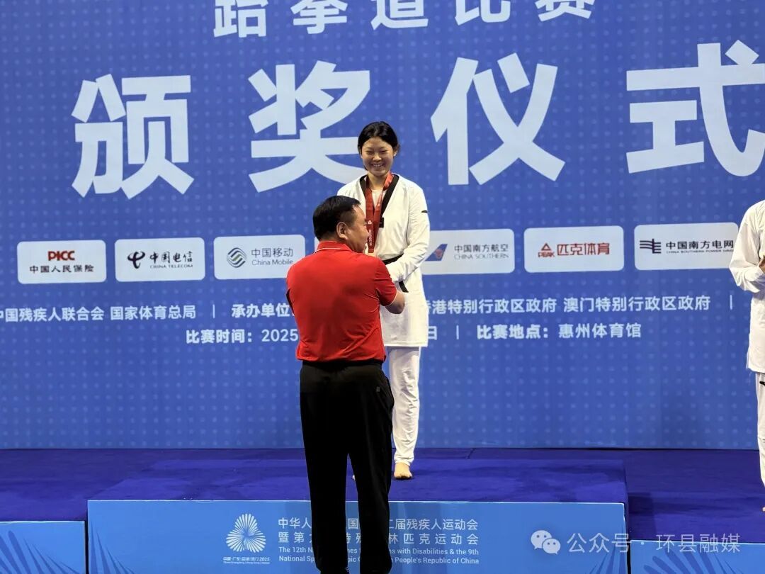 2025年9月12日,在全國第十二屆殘運(yùn)會暨第九屆特奧會跆拳道賽場上傳來捷報(bào)。在女子PK60/67公斤以上級的比賽中,環(huán)縣籍運(yùn)動員王蘭蘭連克山東、四川等名將,以全勝戰(zhàn)績勇奪桂冠,為甘肅代表團(tuán)斬獲一枚沉甸甸的金牌。