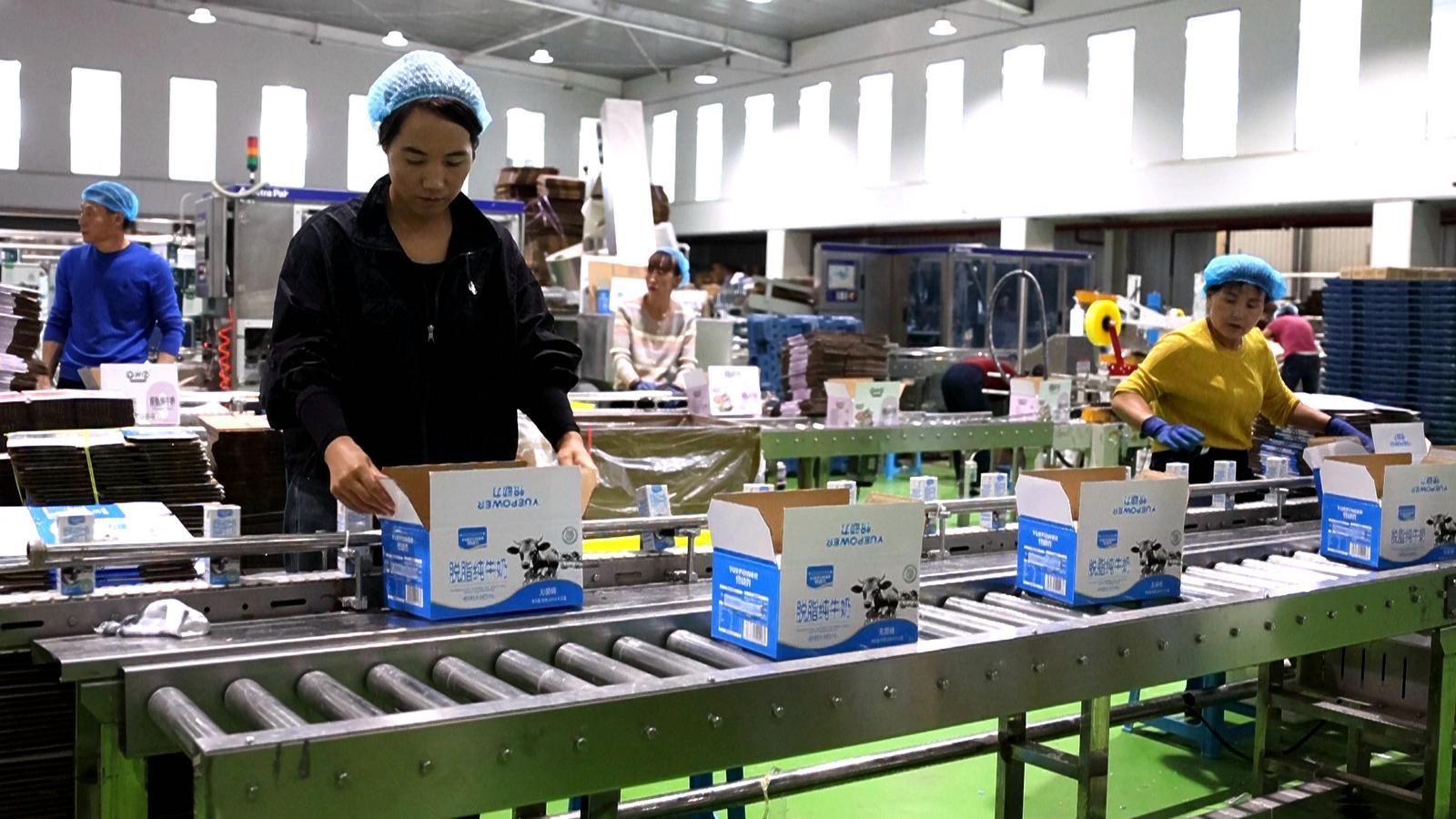 甘肅樸牛乳業(yè)有限公司生產(chǎn)車間里,工人將牛奶裝箱。通訊員 馮泳縈 攝