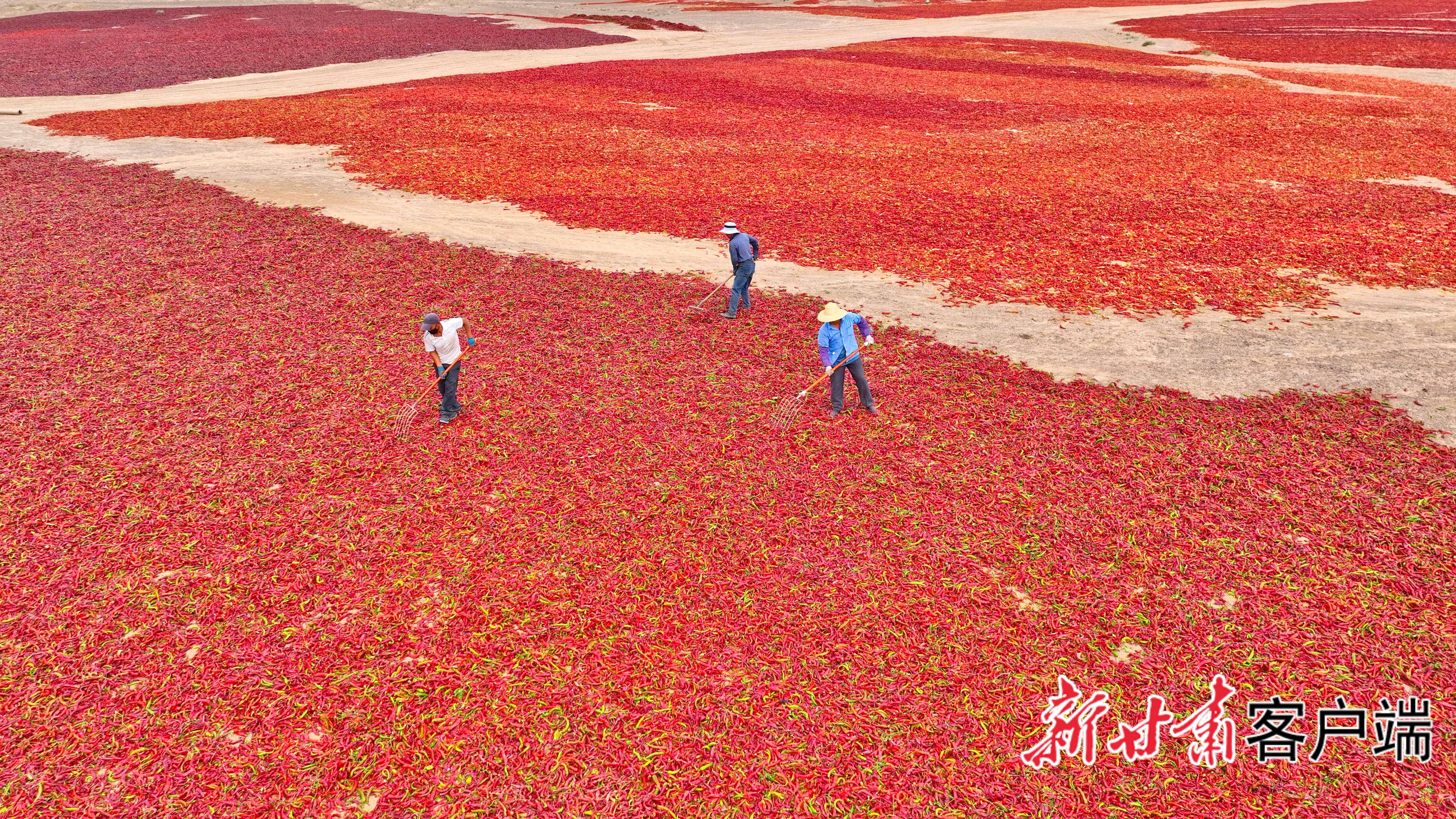 高臺縣黑泉鎮(zhèn)十壩珍珠灘辣椒晾曬場上,種植戶正在晾曬紅辣椒。新甘肅·甘肅日報通訊員 王 將