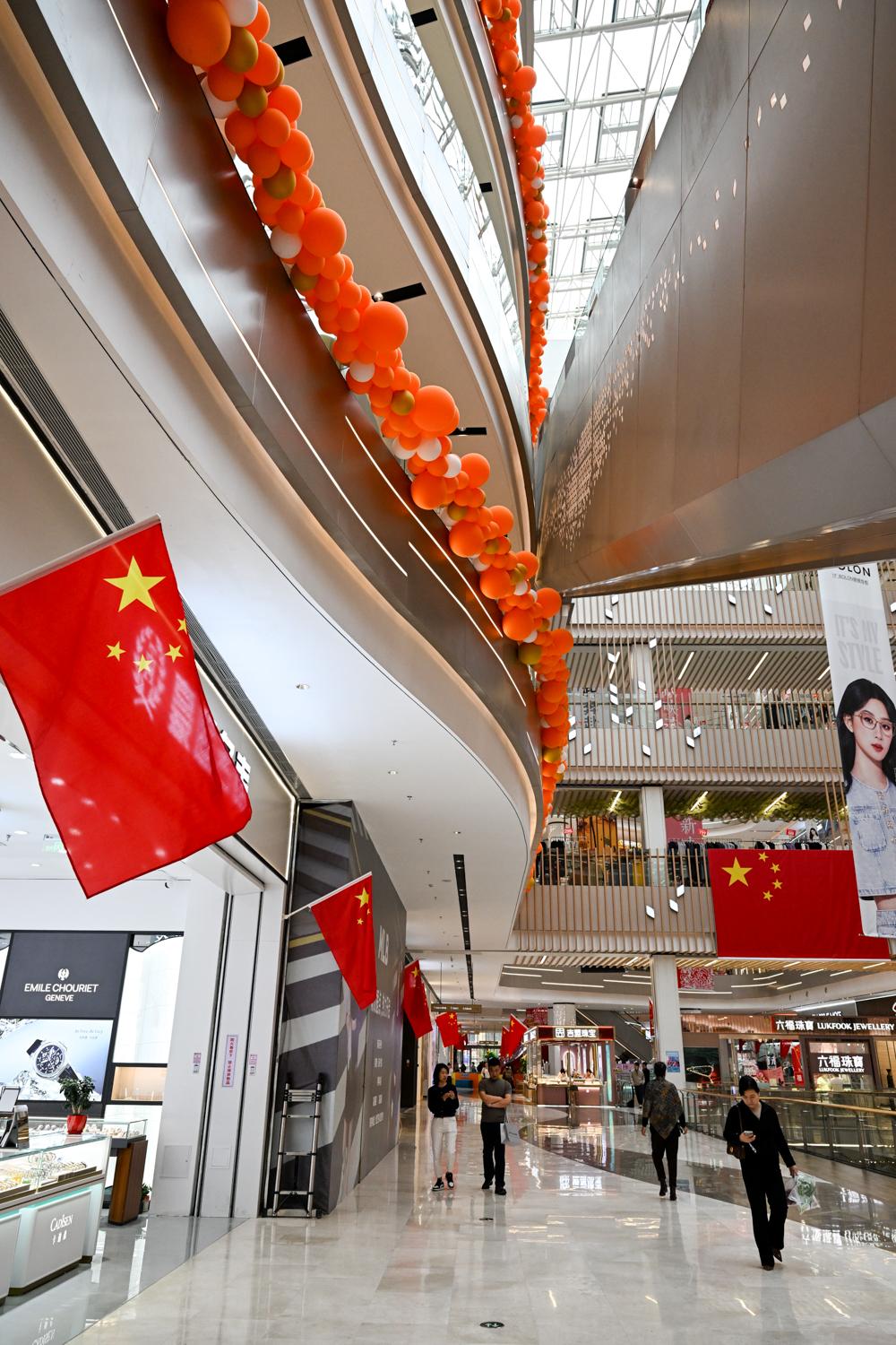 西峰區(qū)一家商場內(nèi),五星紅旗裝扮其間。