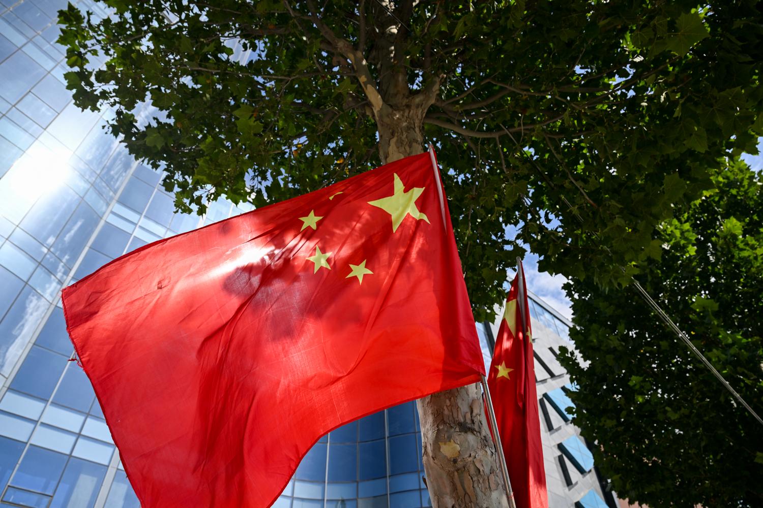 西峰區(qū)隴東大道,商鋪門前懸掛五星紅旗。