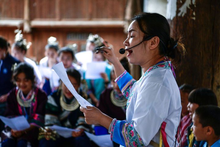 隨著國(guó)產(chǎn)動(dòng)畫電影《哪吒之魔童鬧?!凡粩嗨⑿轮袊?guó)影史票房紀(jì)錄,參與電影配樂的貴州省榕江縣三寶侗寨的楊想妮和“舞樂蟬歌”團(tuán)隊(duì)為更多人所熟知。樂團(tuán)成員懷揣“用音樂傳遞侗族文化,讓世界聽見侗族大歌”的共同夢(mèng)想,將侗族大歌推向更廣闊的舞臺(tái)。這是2025年4月22日,楊想妮在貴州省黎平縣肇興鎮(zhèn)廈格侗寨教前來研學(xué)的孩子們唱侗歌。