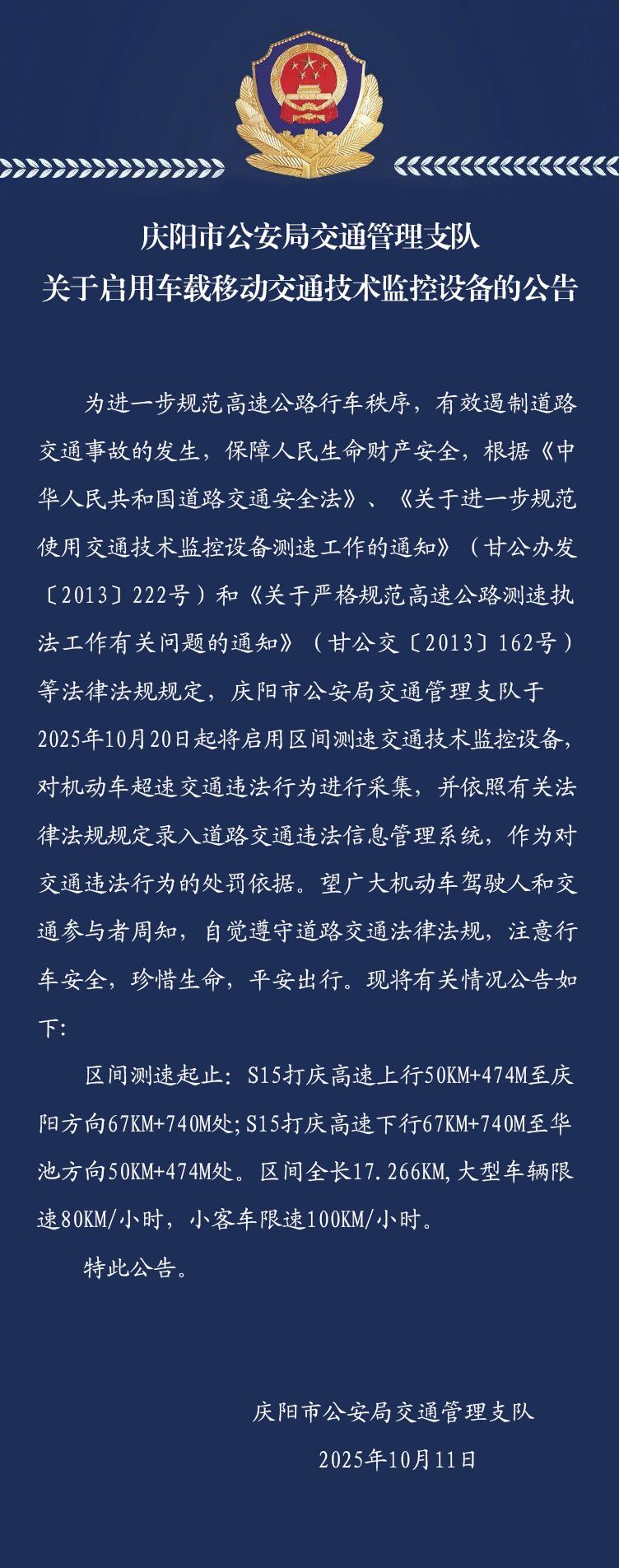 慶陽市公安局交通管理支隊(duì)關(guān)于啟用車載移動交通技術(shù)監(jiān)控設(shè)備的公告