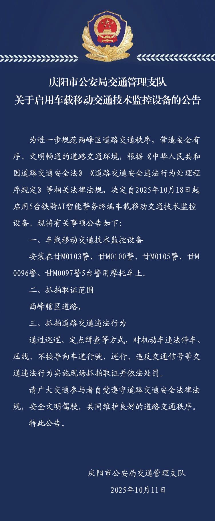 慶陽市公安局交通管理支隊關(guān)于啟用車載移動交通技術(shù)監(jiān)控設(shè)備的公告