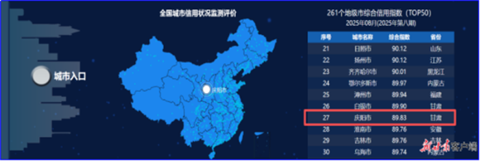 新甘肅客戶端慶陽10月15日訊(新甘肅·甘肅日報(bào)記者 安志鵬)記者從慶陽市營商環(huán)境建設(shè)局獲悉,在國家公共信用和地理空間信息中心近日發(fā)布的最新一期城市信用監(jiān)測結(jié)果中,慶陽市綜合信用指數(shù)89.83,在全國261個(gè)地級市中排名第27位,首次躋身全國前30,較去年同期上升80個(gè)位次。