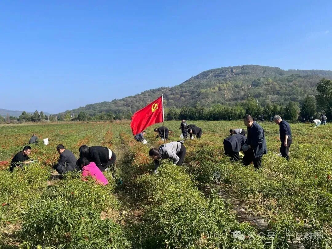 在湘樂鎮(zhèn)湘樂村辣椒基地,黨旗飄揚,連片的辣椒紅得油光發(fā)亮,像一串串懸掛在枝頭的紅燈籠。隨處可見干部職工們忙碌的身影,他們俯身于田壟間,與農(nóng)戶并肩作戰(zhàn),熟練地采摘、分揀、裝袋。鮮艷的黨旗、忙碌的身影與火紅的辣椒交織成一幅動人的畫卷。