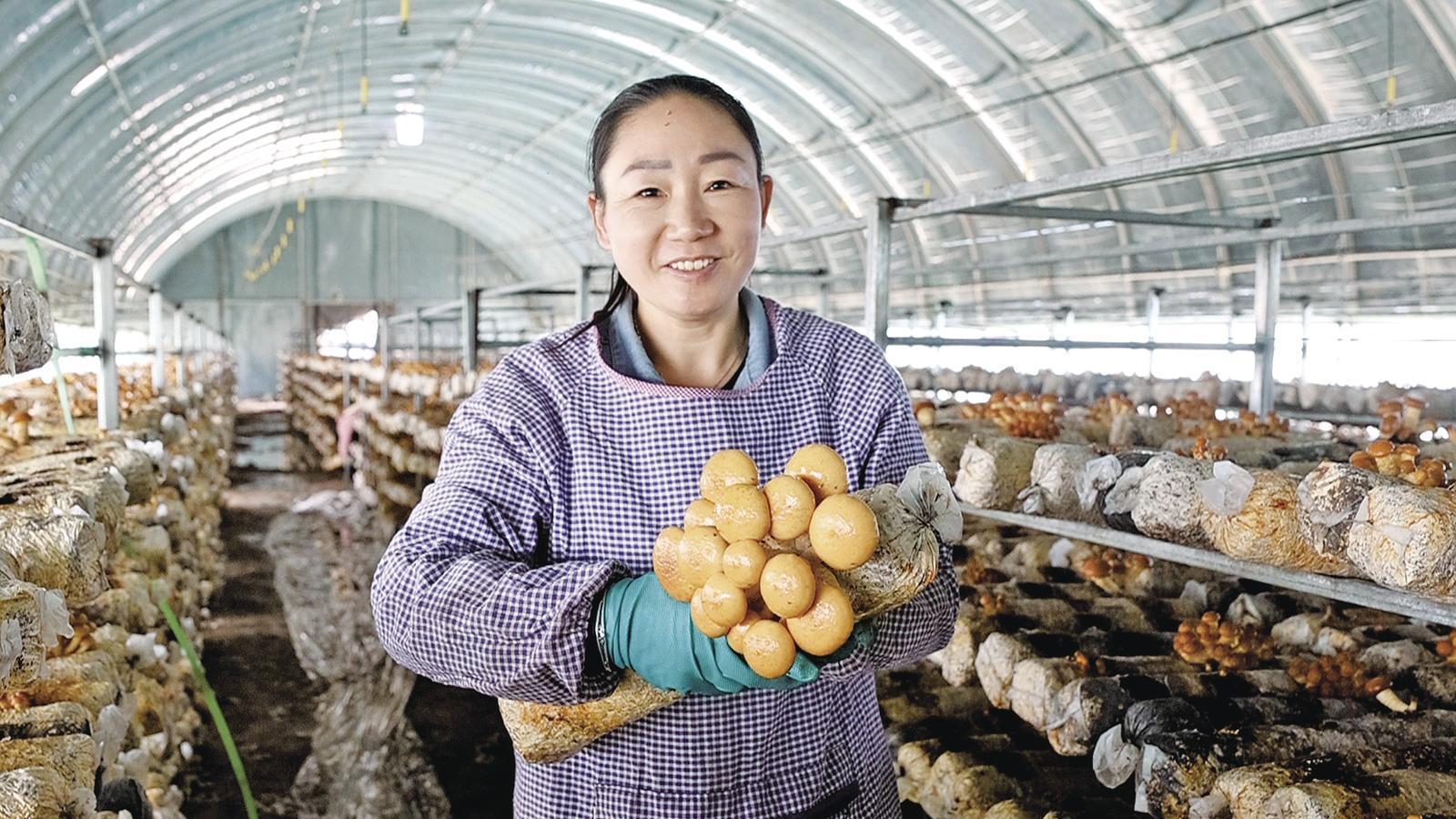 采摘工人展示飽滿鮮嫩的滑子菇。 通訊員 雷彩利 攝