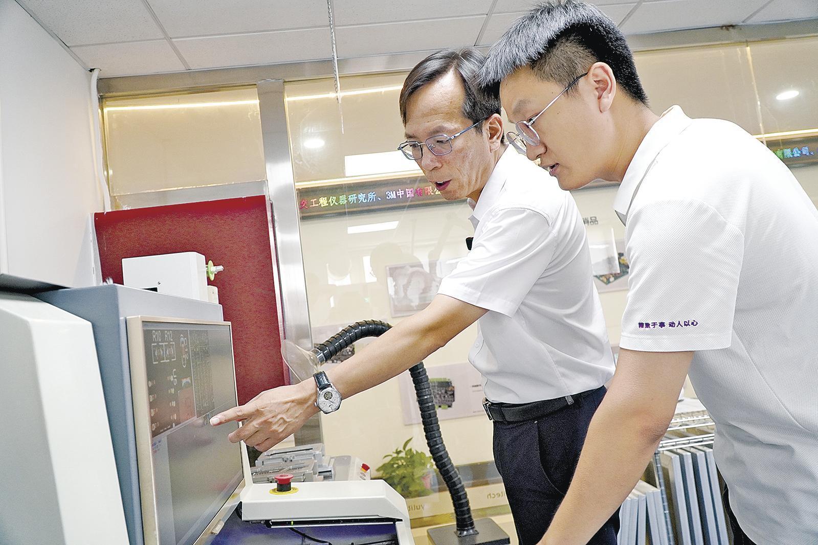 栗旭錦(左)與公司總經(jīng)理李鵬真探討設(shè)計(jì)研發(fā)方案。 慶陽融媒記者 孫玉珍攝