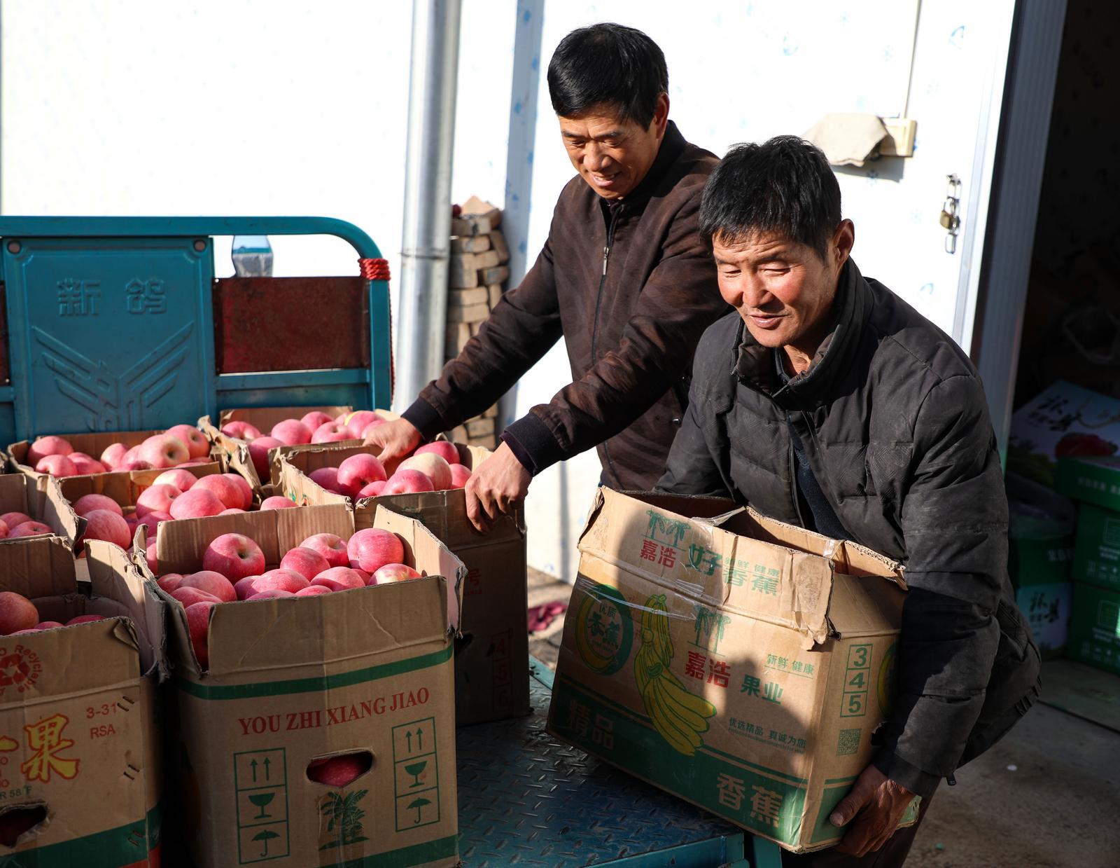 果農(nóng)將蘋果分揀裝箱。