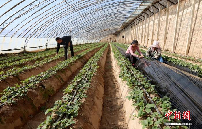圖為慶陽(yáng)萬(wàn)潤(rùn)園種植養(yǎng)殖農(nóng)民專業(yè)合作社,種植戶管護(hù)草莓。(資料圖)盤(pán)小美 攝