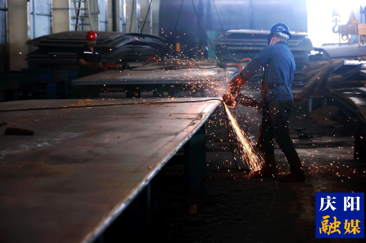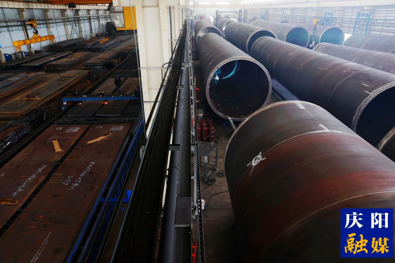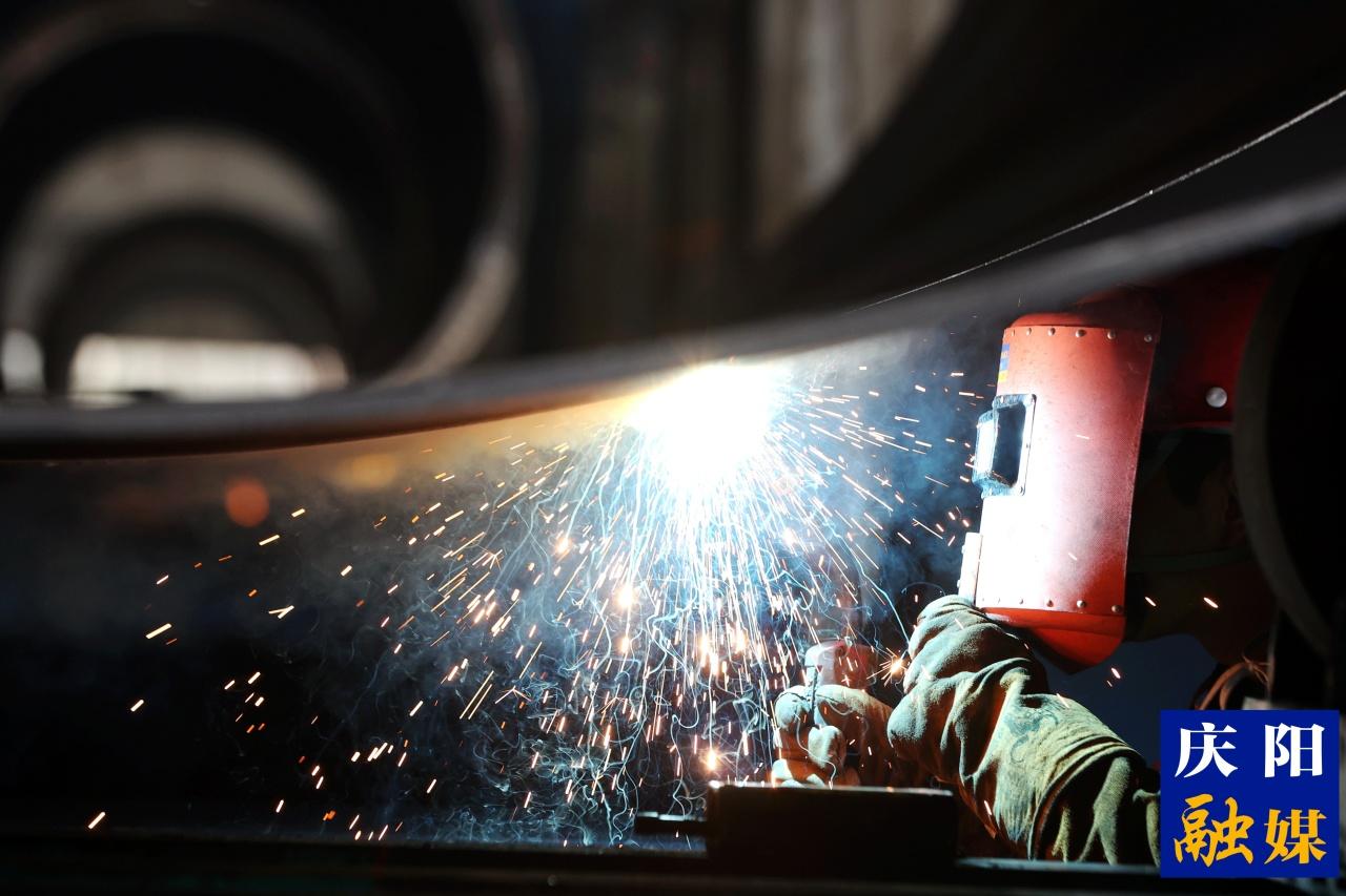 位于寧縣和盛鎮(zhèn)瑞慶新能源集團裝備制造基地的甘肅馳風重工有限公司風電塔筒生產車間內鋼花四濺。