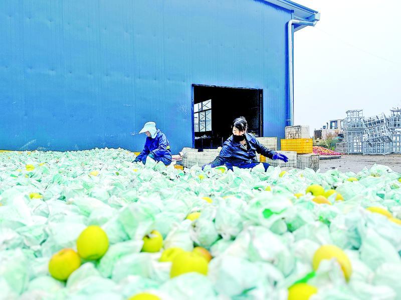 鐵樓村三面環(huán)溝,光照充足,晝夜溫差大。憑借得天獨(dú)厚的自然條件,這里產(chǎn)出的蘋(píng)果以果形大、色澤亮、口感脆甜、汁多味美而聞名。此次豐收的“瑞雪”蘋(píng)果,屬晚熟黃綠色短枝型,具有果面光潔、皮薄多汁、果香濃郁且極耐儲(chǔ)存的特點(diǎn),一經(jīng)成熟便吸引了眾多客商線上線下?tīng)?zhēng)相訂購(gòu)。