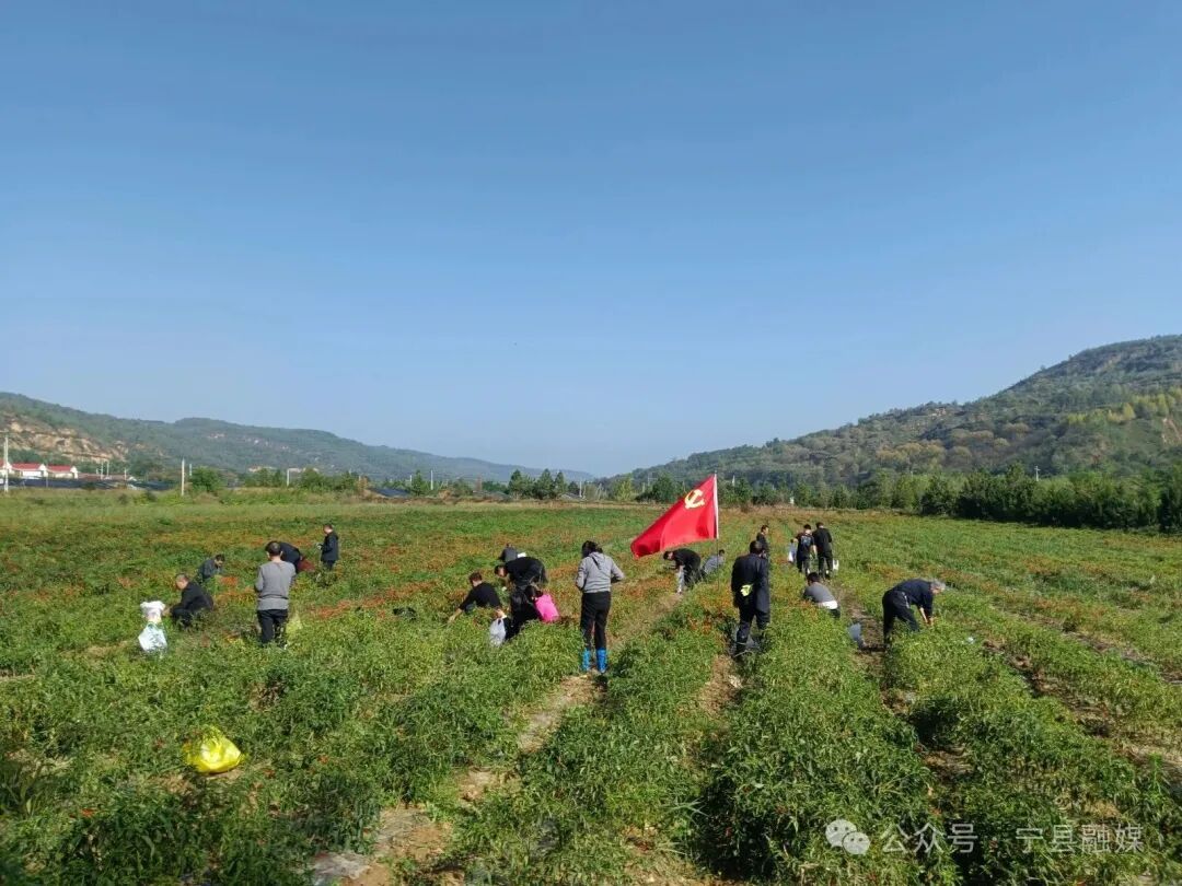 寧縣黨員干部在湘樂(lè)鎮(zhèn)連片辣椒種植基地采摘辣椒
