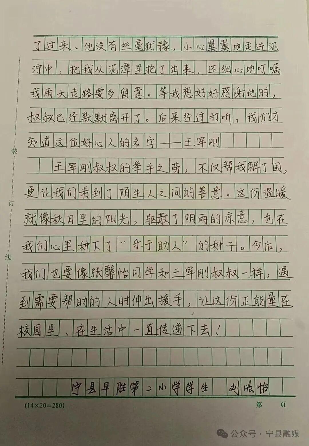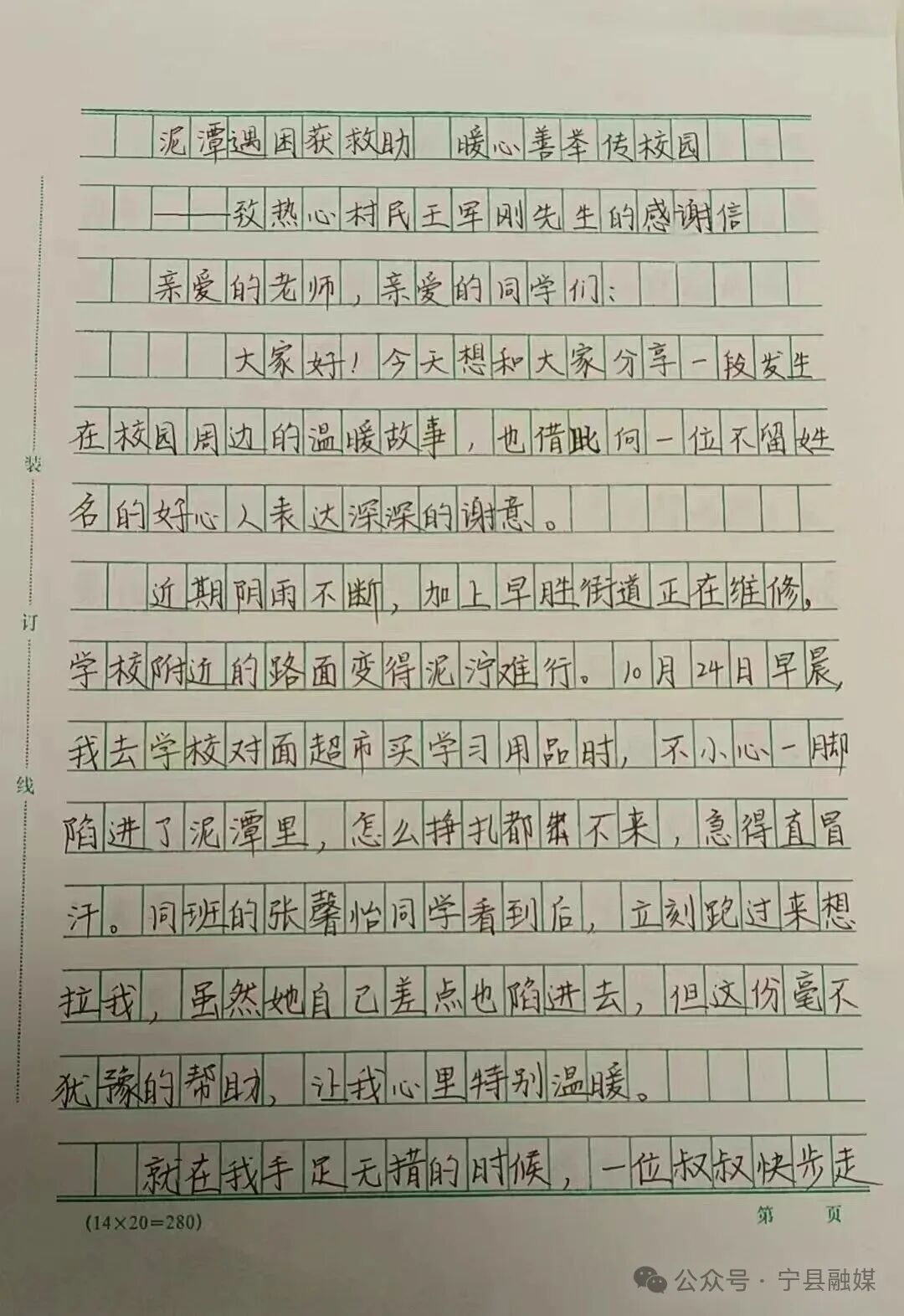 “王叔叔,您的幫助對(duì)我來(lái)說(shuō)不只是把我從泥潭里拉出來(lái),更讓我看到,陌生人之間也有這么溫暖的關(guān)懷。這件事我會(huì)一直記在心里。我以后也要像您一樣盡自己所能去幫助身邊需要幫助的人,把這份好心傳遞下去……”日前,一份致《寧縣義警協(xié)會(huì)中村義警中隊(duì)王軍剛叔叔的感謝信》在寧縣早勝、中村附近十里八村廣為傳頌,人們都豎起大拇指,紛紛稱贊義警王軍剛的暖心善舉。