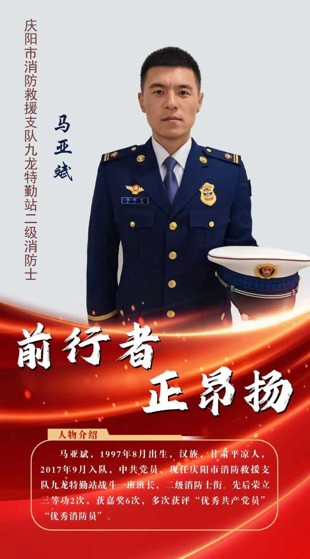 馬亞斌,男,漢族,甘肅平?jīng)鋈耍?997年8月出生,2017年9月入隊(duì),中共黨員,現(xiàn)任慶陽(yáng)市消防救援支隊(duì)九龍?zhí)厍谡緫?zhàn)斗一班班長(zhǎng),二級(jí)消防士銜。