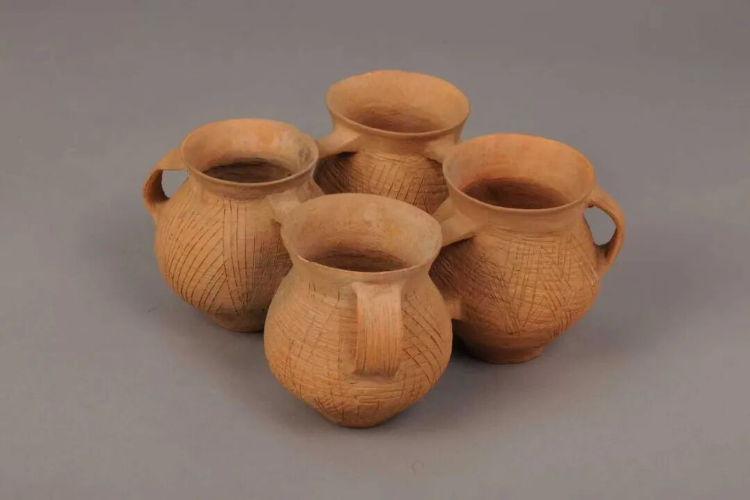 泥質(zhì)紅陶,敞口、束頸、單耳、鼓腹、平底,腹部均飾斜籃紋及刻劃紋。四個(gè)單耳罐相互連接在一起,是常山下層文化器物中少見的器型之一,全國獨(dú)一無二,十分珍貴。