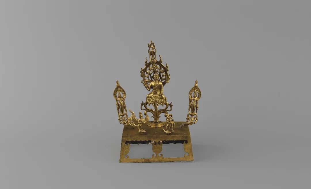 出土于鎮(zhèn)原縣新集鄉(xiāng),1996年被評定為一級文物。主體基座為長方形壸門臺(tái)座,主尊阿彌陀佛結(jié)跏趺坐于忍冬枝蔓托舉的蓮臺(tái)上。高肉髻,大耳垂肩,面相豐滿圓潤,眉如彎弓,眉間有白毫,雙目俯視,神態(tài)沉靜慈祥;蓮瓣形頭光較大,由鏤空式三重火焰紋組成,頭光頂端有一向下飛翔而來的飛天;佛著袒右式袈裟,衣紋流暢自然,佛衣下擺自蓮臺(tái)上垂搭而下。
